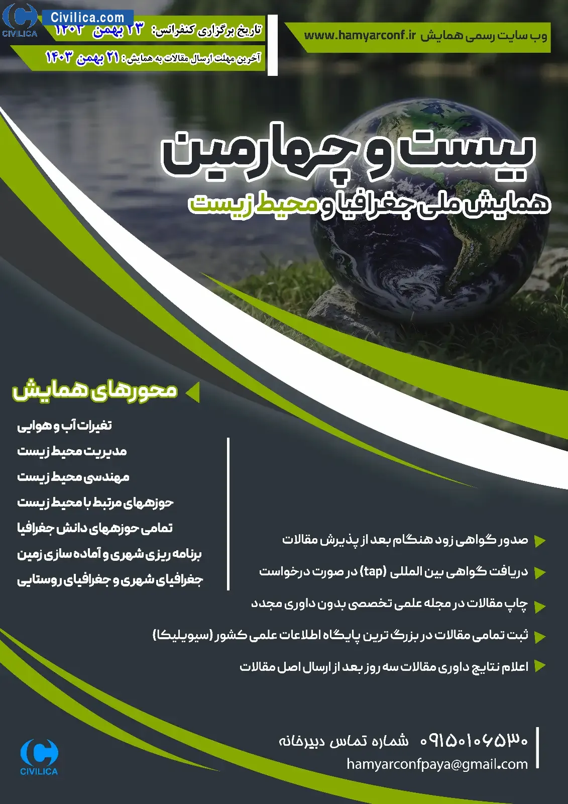 The 24th National Conference on Geography and Environment In date 2025-02-11 by ,موسسه پایاشهرمجله غیر انتفاعی پایاشهردبیر خانه دائمی کنفرانس in City Shirvan was held. please refer to the following link to download all the papers of conference proceedings: Proceedings The 24th National Conference on Geography and Environment