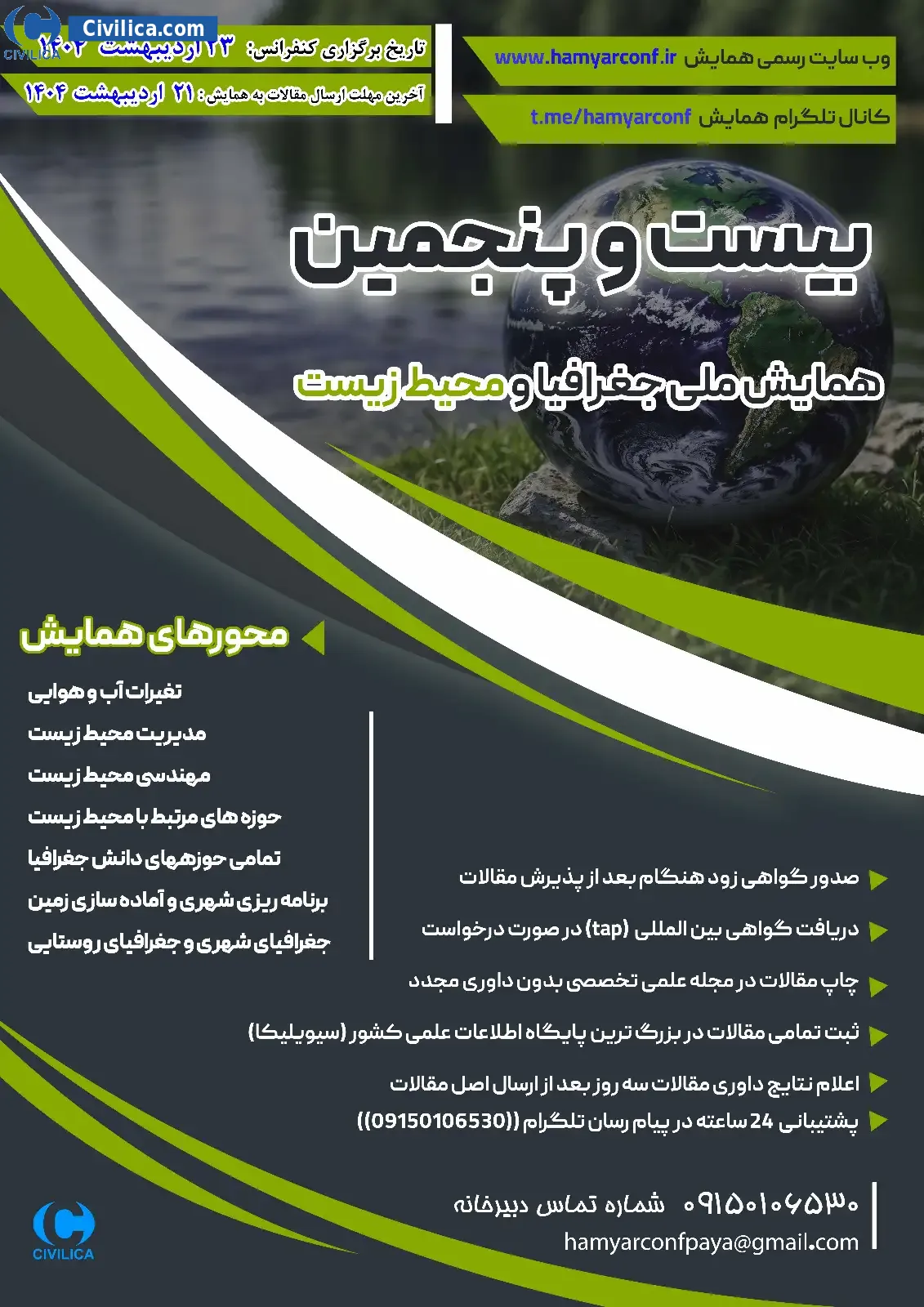 The 25th National Conference on Geography and Environment In date 2025-05-13 by ,موسسه پایاشهرمجله علمی تخصصی پایاشهر دبیرخانه دائمی in City Shirvan was held. please refer to the following link to download all the papers of conference proceedings: Proceedings The 25th National Conference on Geography and Environment