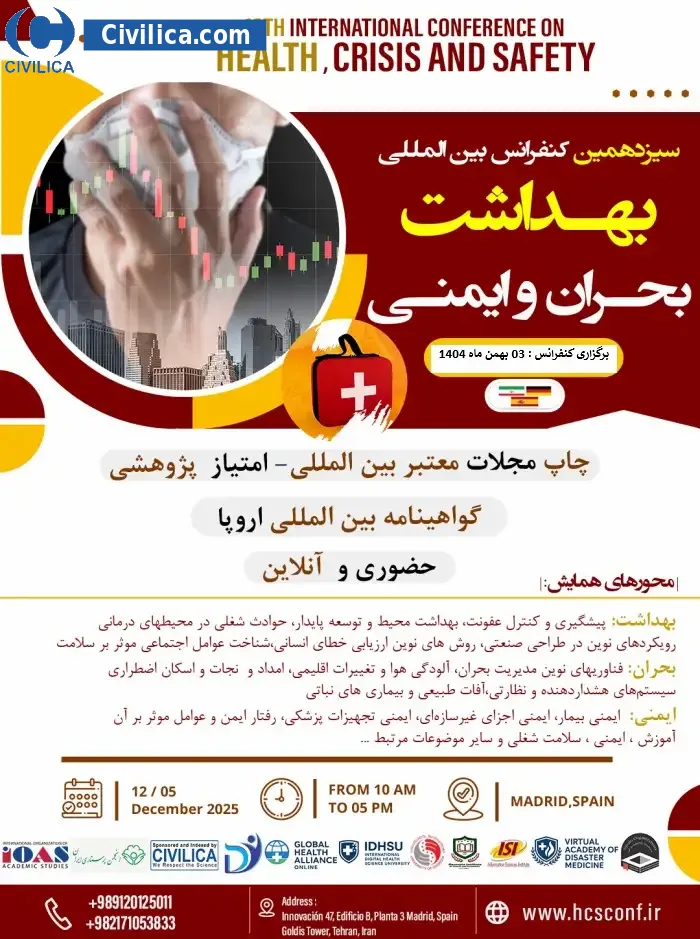 13th International Conference on Health, Crisis and Safety In date 2026-01-23 by ,سازمان بین المللی مطالعات دانشگاهی will be held.Since the conference held officially, all of this Conference paper and proceedings will be indexed in the Civilica database and Iranian Consortium of National Content (ICNC) and you can have full confidence.