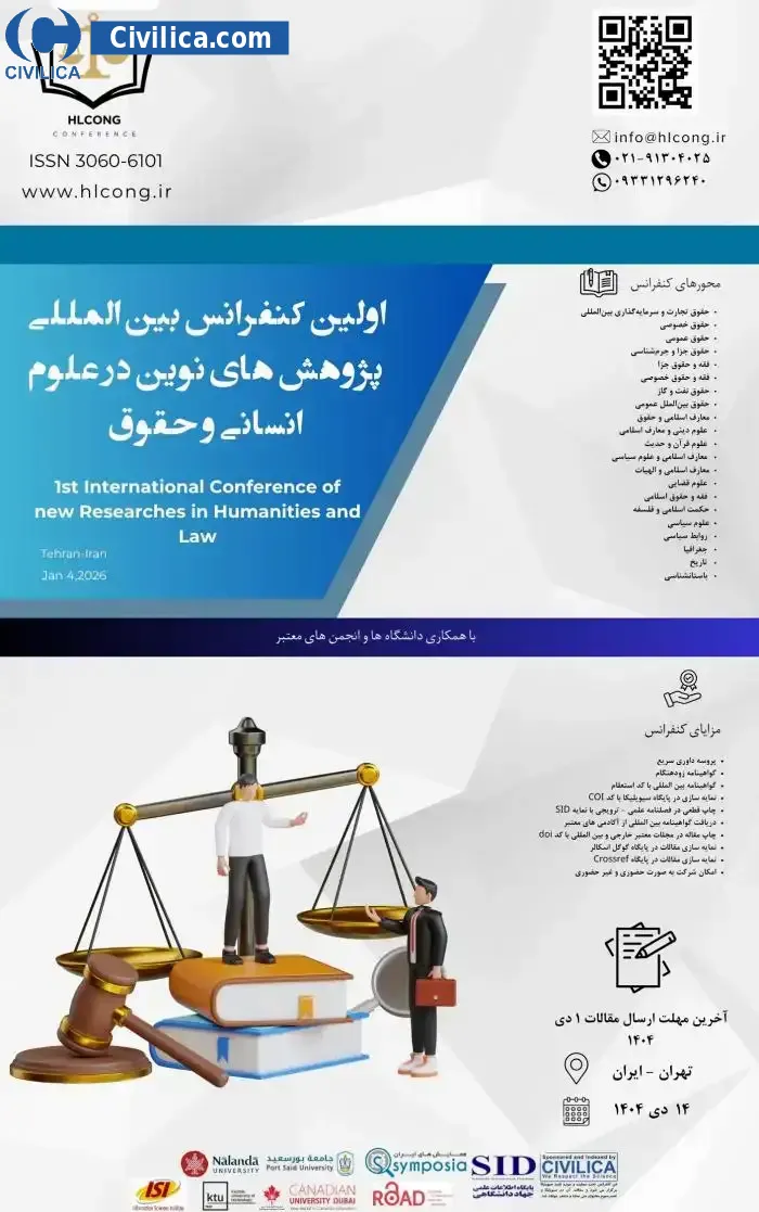 1st International Conference of new Researches in Humanities and Law In date 2026-01-04 by ,همایش آروین البرز in City Tehran will be held.Since the conference held officially, all of this Conference paper and proceedings will be indexed in the Civilica database and Iranian Consortium of National Content (ICNC) and you can have full confidence.