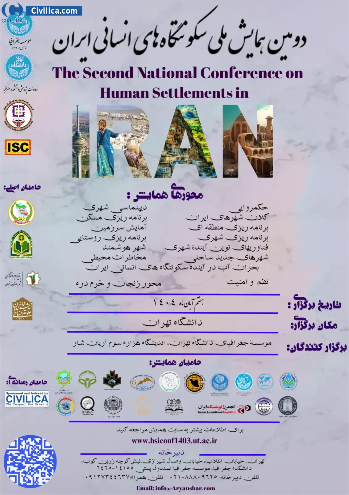 The Second National Conference on Human Settlements in Iran In date 2025-10-29 by University of Tehran,موسسه جغرافیا دانشگاه تهرانموسسه اندیشگاه هزاره سوم آریان شار in City Tehran was held.This conference is held by Civilica Sponsoring and articles and will be indexed in CIVILICA