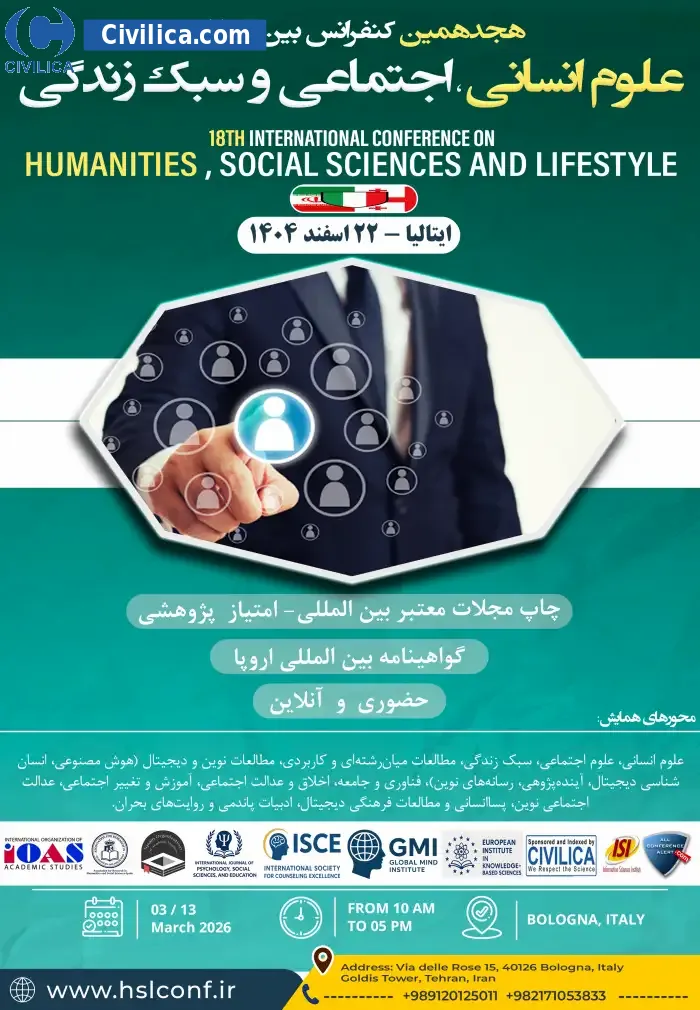 18th International Conference on Humanities, Social Sciences and Lifestyle In date 2026-03-13 by ,سازمان بین المللی مطالعات دانشگاهی will be held.Since the conference held officially, all of this Conference paper and proceedings will be indexed in the Civilica database and Iranian Consortium of National Content (ICNC) and you can have full confidence.