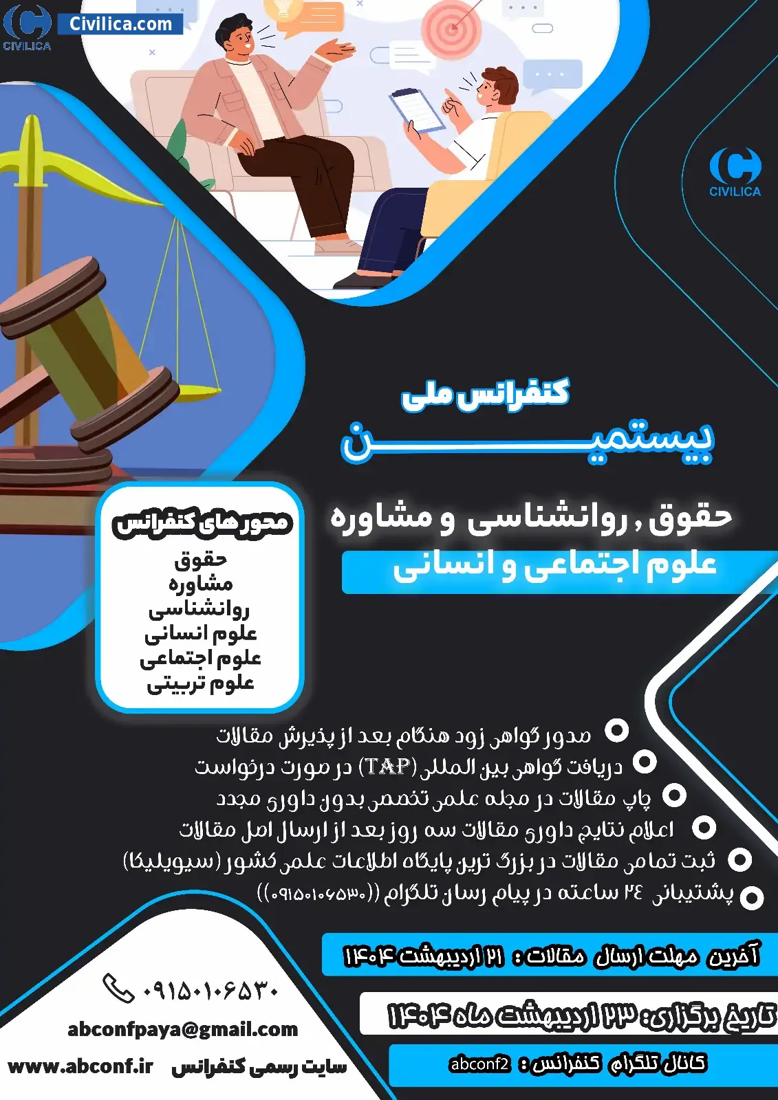20th National Conference on Law, Social Sciences and Humanities, Psychology and Counseling In date 2025-05-13 by ,موسسه پایاشهرمجله علمی تخصصی پایاشهردبیرخانه دائمی in City Shirvan was held. please refer to the following link to download all the papers of conference proceedings: Proceedings 20th National Conference on Law, Social Sciences and Humanities, Psychology and Counseling