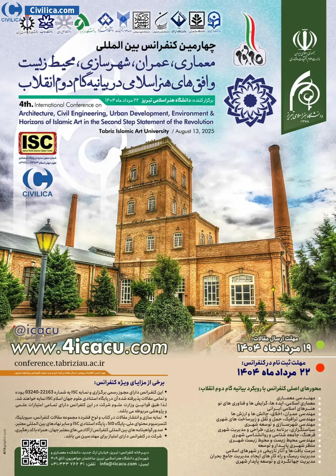 The Fourth International Conference on Architecture, Civil Engineering, Urban Development, Environment and Horizons of Islamic Art in the Declaration of the Second Step of the Revolution In date 2025-08-13 by Tabriz Islamic Art University، Iran University of Science and Technology، Shahid Beheshti University، University of Mohaghegh Ardabili، Alzahra University، Shahrekord University، Urmia University، Islamic Azad University of Science and Research Branch, Tehran، Soore International University، Isfahan University of Art، Arak University، University of Mazandaran,و ساير دانشگاه هاي برجسته كشور was held. please refer to the following link to download all the papers of conference proceedings: Proceedings The Fourth International Conference on Architecture, Civil Engineering, Urban Development, Environment and Horizons of Islamic Art in the Declaration of the Second Step of the Revolution