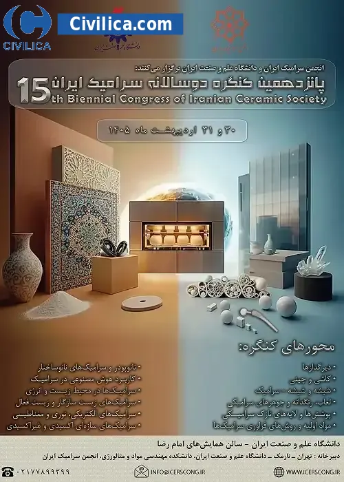 The 15th Biennial Congress of Iranian Ceramic Society In date 2026-05-20 by Iran University of Science and Technology,Iranian Ceramic Society in City Tehran will be held.Since the conference held officially, all of this Conference paper and proceedings will be indexed in the Civilica database and Iranian Consortium of National Content (ICNC) and you can have full confidence.