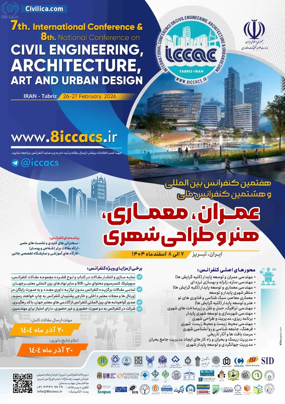 7th.International Conference & 8th.national Conference on Civil Engineering, Architecture, Art and Urban Design In date 2026-02-26 by Kharazmi University، Shahrekord University، Kosar University,دبیرخانه دائمی کنفرانس با همکاریو سایر دانشگاه های برجسته کشور in City Tabriz will be held.Since the conference held officially, all of this Conference paper and proceedings will be indexed in the Civilica database and Iranian Consortium of National Content (ICNC) and you can have full confidence.