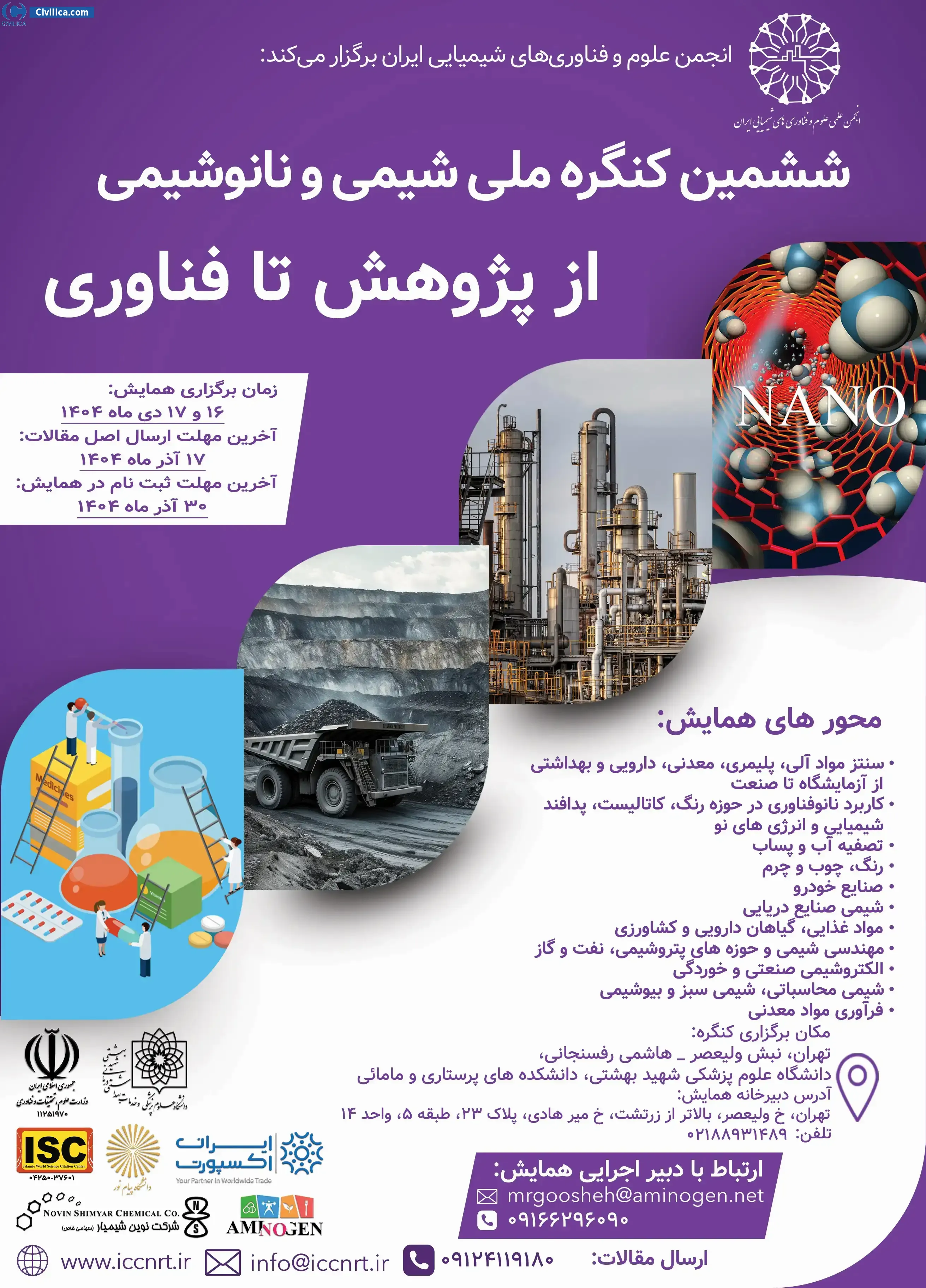 6th national Congress of Chemistry and Nanochemistry from Research to Technology In date 2026-01-06 by ,Iranian Chemical Science and Technologies Associationa in City Tehran will be held.Since the conference held officially, all of this Conference paper and proceedings will be indexed in the Civilica database and Iranian Consortium of National Content (ICNC) and you can have full confidence.