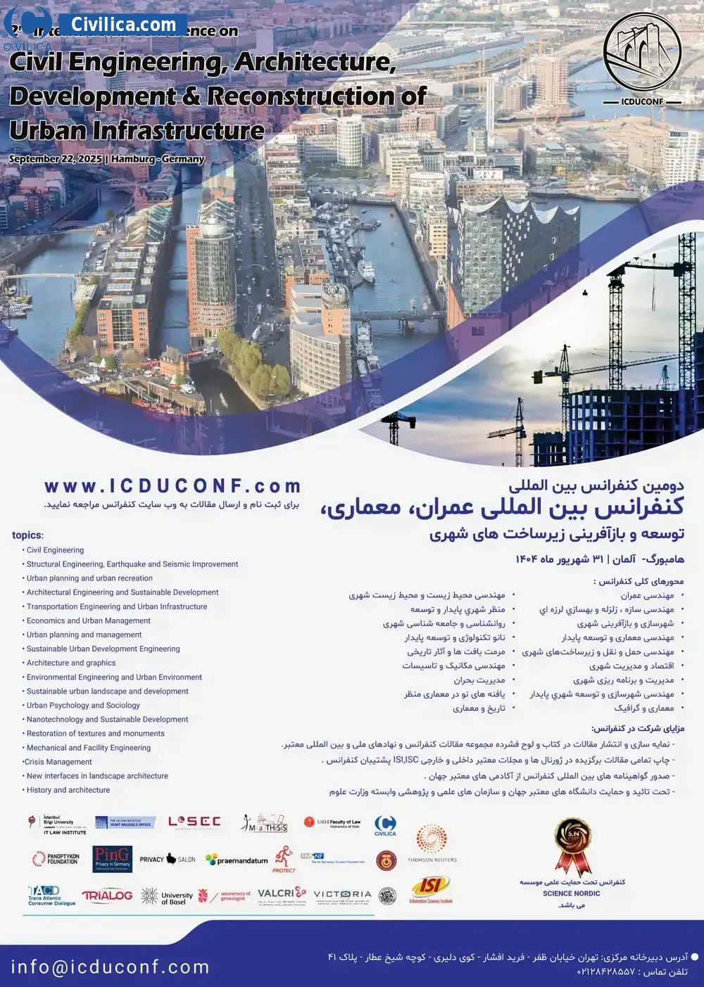 Second International Conference on Civil, Architecture, Development and Reconstruction of Urban Infrastructure In date 2026-02-19 by ,دبیرخانه دائمی کنفرانس و با همکاری انجمن مهندسیIET will be held.Since the conference held officially, all of this Conference paper and proceedings will be indexed in the Civilica database and Iranian Consortium of National Content (ICNC) and you can have full confidence.
