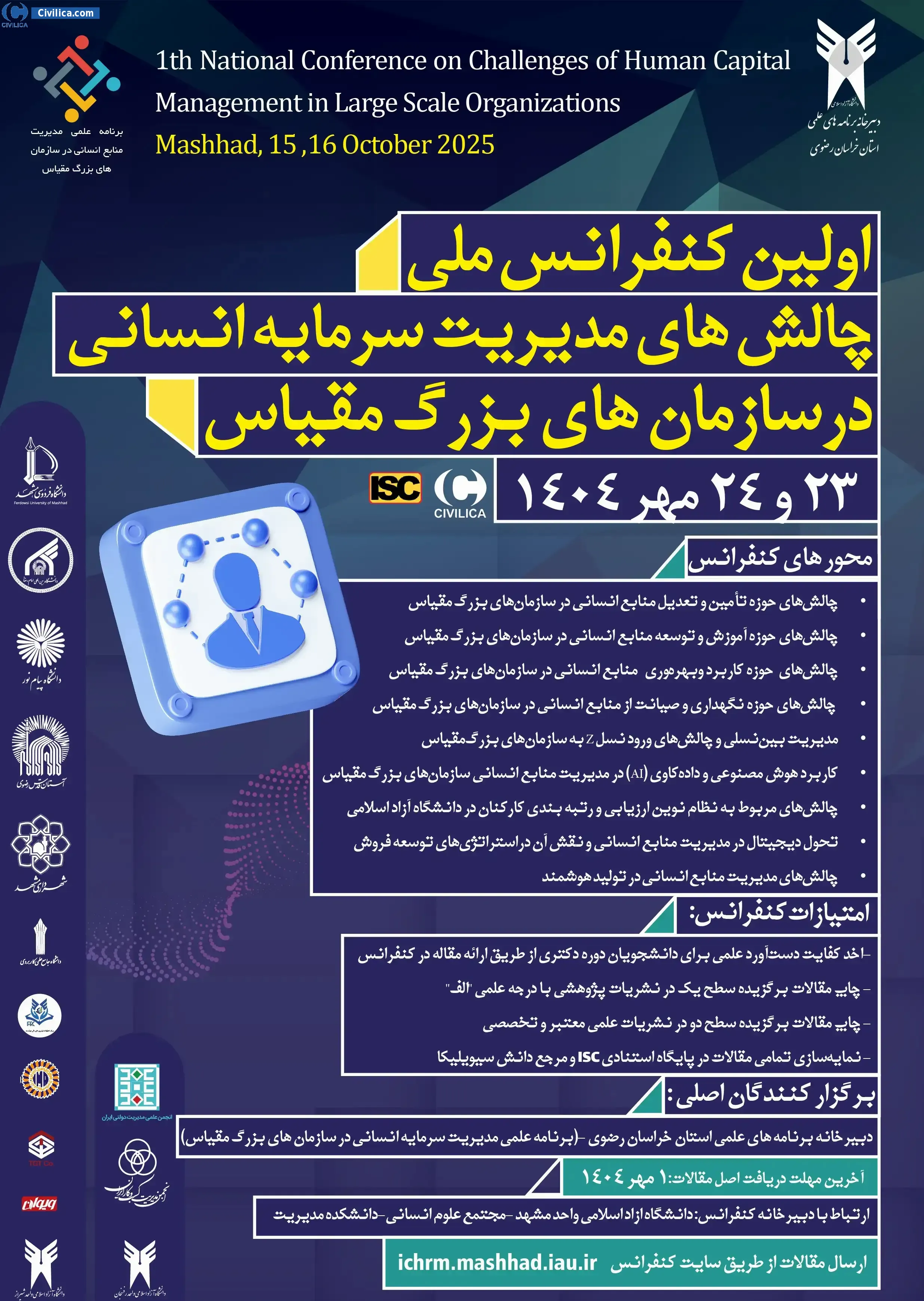 1th national conference on challenges of human capital management in large scale organizations In date 2025-10-15 by Islamic Azad University of Mashhad, in City Mashhad was held.This conference is held by Civilica Sponsoring and articles and will be indexed in CIVILICA