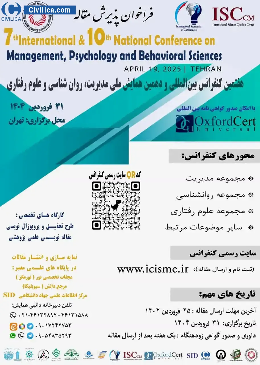 7th International & 10th National Conference on Management, Psychology and Behavioral Sciences In date 2025-04-20 by ,موسسه پژوهشی مدیریت مدبر in City Tehran was held. please refer to the following link to download all the papers of conference proceedings: Proceedings 7th International & 10th National Conference on Management, Psychology and Behavioral Sciences