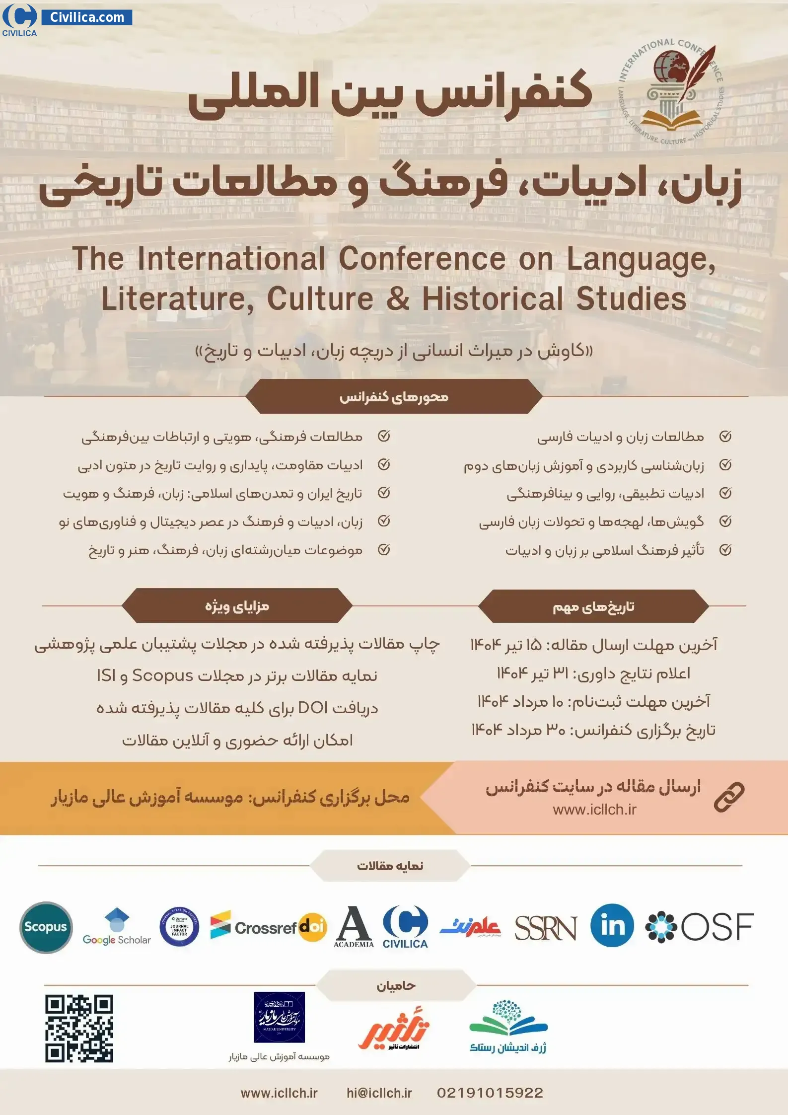 The International Conference on Language, Literature, Culture & Historical Studies In date 2025-08-21 by Maziar University,ژرف اندیشان رستاک in City Nur was held. please refer to the following link to download all the papers of conference proceedings: Proceedings The International Conference on Language, Literature, Culture & Historical Studies