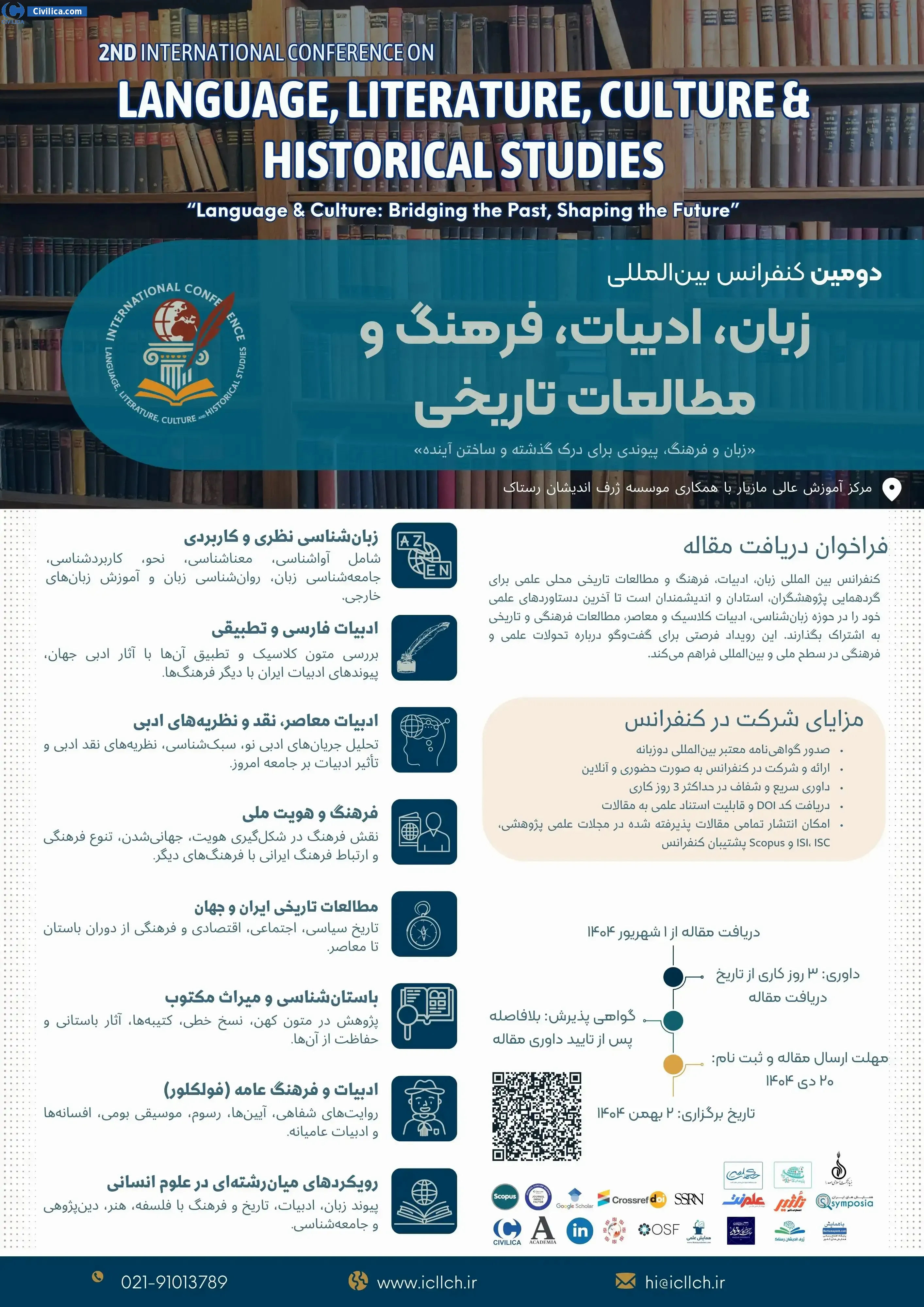 2nd International Conference on Language, Literature, Culture & Historical Studies In date 2026-01-22 by Maziar University,ژرف اندیشان رستاک in City Nowshahr will be held.Since the conference held officially, all of this Conference paper and proceedings will be indexed in the Civilica database and Iranian Consortium of National Content (ICNC) and you can have full confidence.