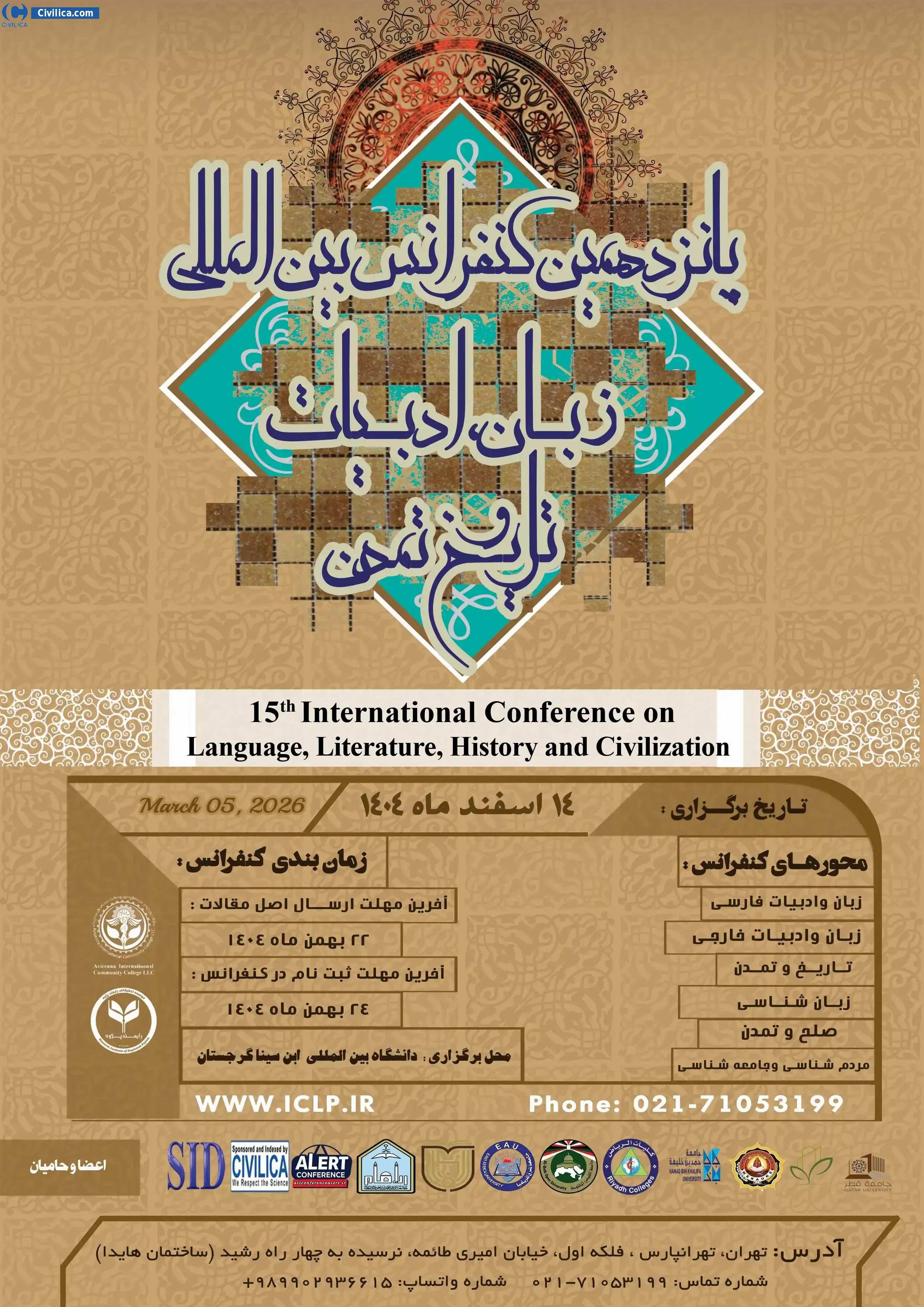 15th International Conference on Language, Literature, History and Civilization In date 2026-03-05 by ,دانشگاه بین المللی ابن سینا گرجستان با همکاری موسسه تحقیقاتی رایمند پژوه will be held.Since the conference held officially, all of this Conference paper and proceedings will be indexed in the Civilica database and Iranian Consortium of National Content (ICNC) and you can have full confidence.