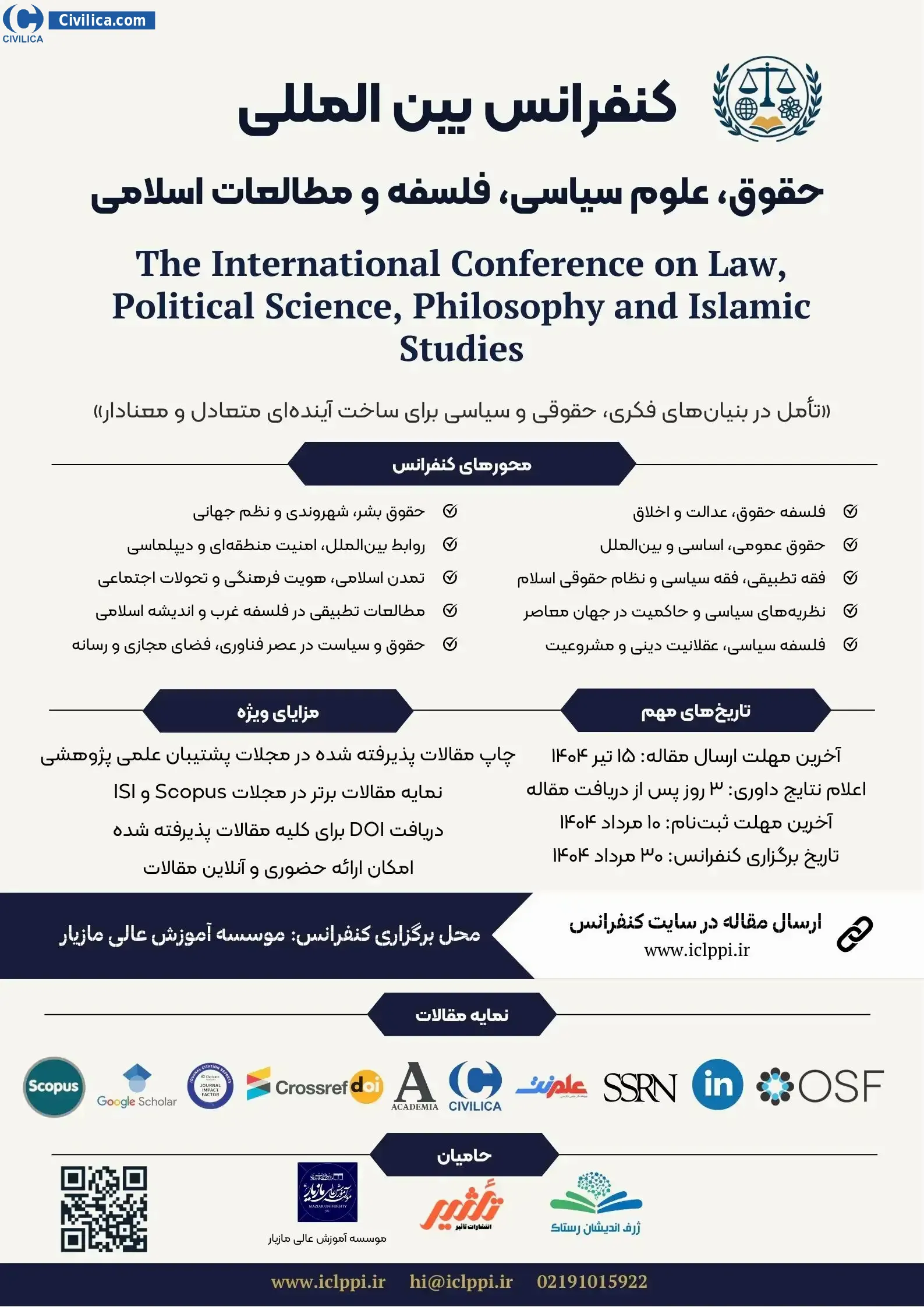The International Conference on Law, Political Science, Philosophy and Islamic Studies In date 2025-08-21 by Maziar University,ژرف اندیشان رستاک in City Nur was held. please refer to the following link to download all the papers of conference proceedings: Proceedings The International Conference on Law, Political Science, Philosophy and Islamic Studies