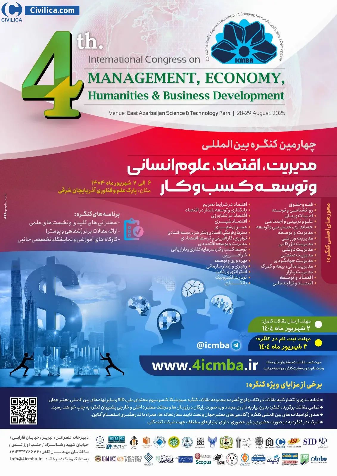 4th.International Congress on Management, Economy, Humanities and Business Development In date 2025-08-28 by ,دبیرخانه دائمی کنگره با همکاری، پارک علم و فناوری آذربایجان شرقی و سایر دانشگاه های برجسته کشور was held. please refer to the following link to download all the papers of conference proceedings: Proceedings 4th.International Congress on Management, Economy, Humanities and Business Development
