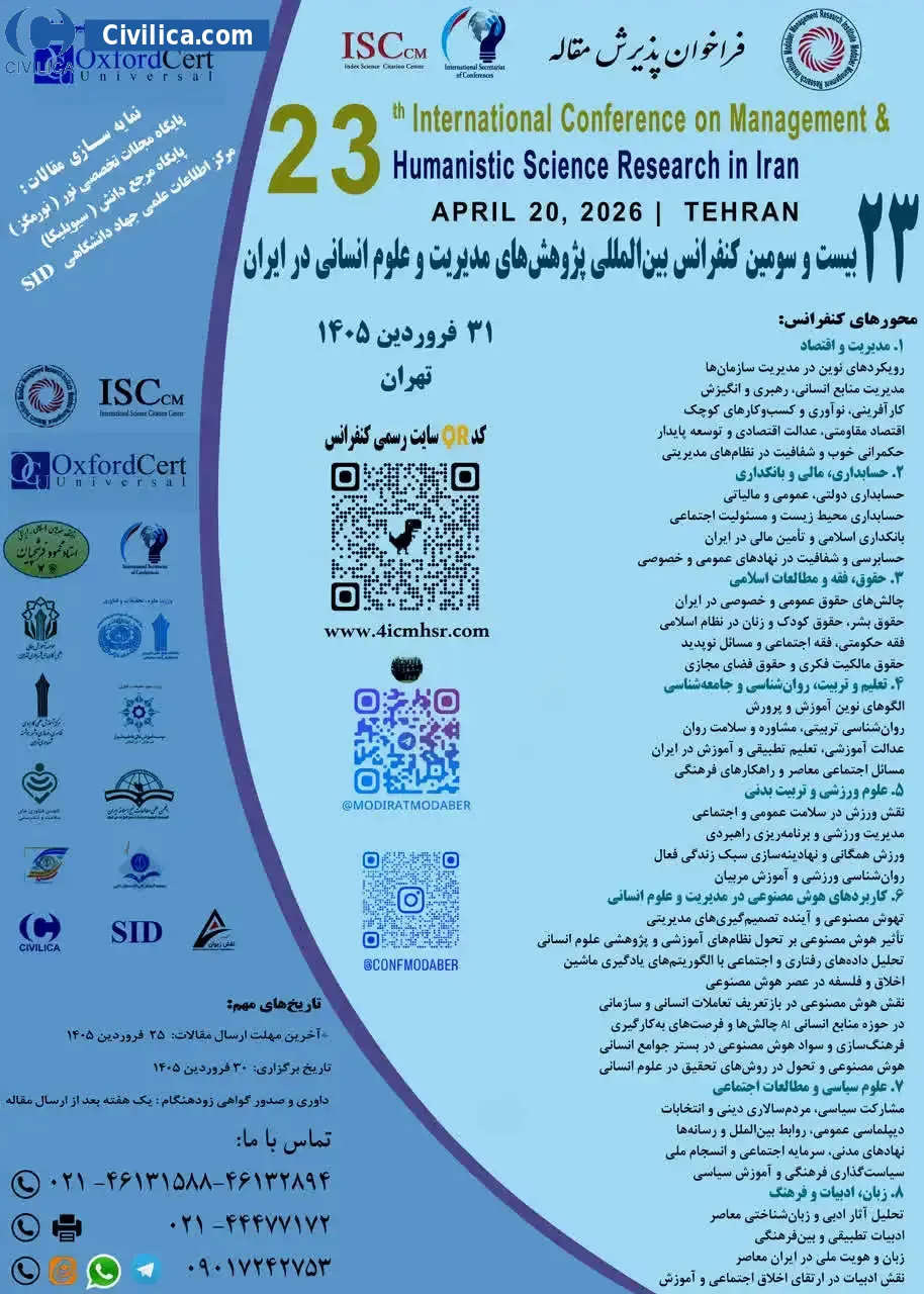 Conference tel: 02146132894Postall Address: تهران، بزرگراه اشرفی اصفهانی، بالاتر از میدان پونک. بلوار کمالی، پلاک ۷، ساختمان گلها، واحد ۱۶. دبیرخانه بین المللی کنفرانس ها