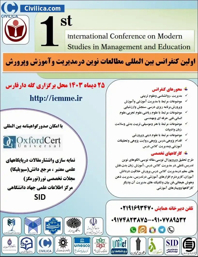 1 st International Conference on Modern Studies in Management and Education In date 2025-01-14 by ,دانشگاههای آزاد ومرکز مهارت آموزی رایانه گستر واداره آموزش وپرورش منطقه گله دار in City Galleh dar was held. please refer to the following link to download all the papers of conference proceedings: Proceedings 1 st International Conference on Modern Studies in Management and Education