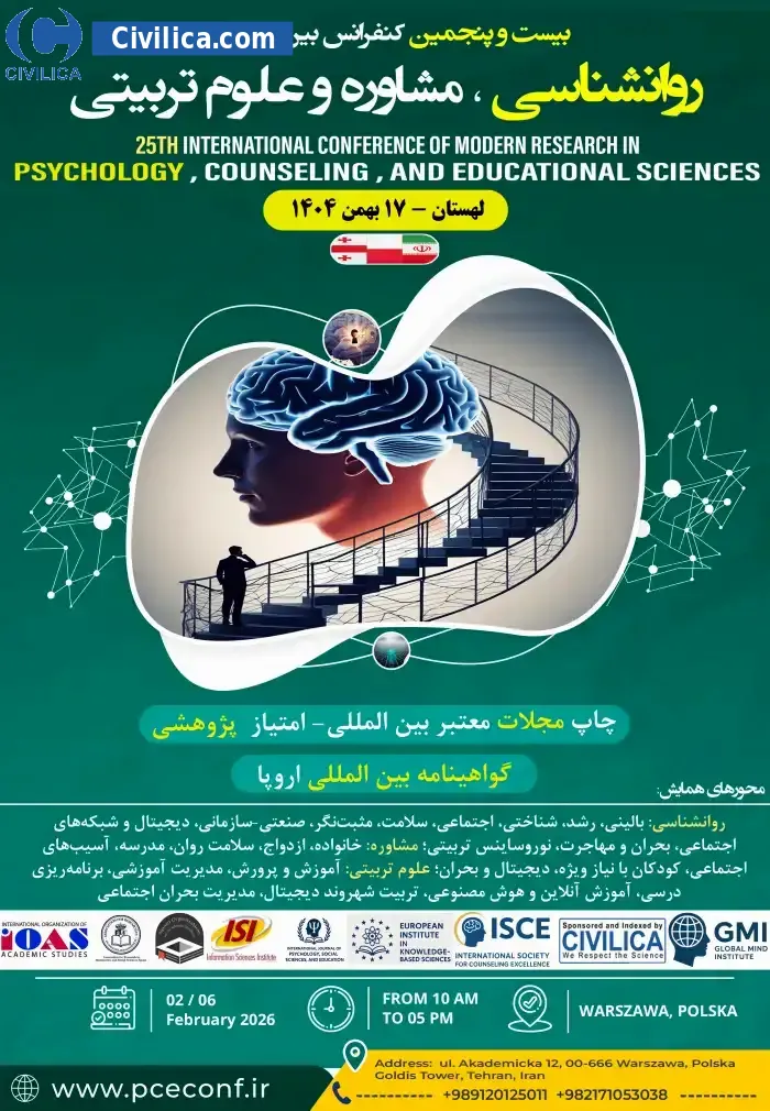 25th International Conference on Psychology, Counseling, and Educational Sciences In date 2026-02-06 by ,سازمان بین المللی مطالعات دانشگاهی(International Organization of Academic Studies will be held.Since the conference held officially, all of this Conference paper and proceedings will be indexed in the Civilica database and Iranian Consortium of National Content (ICNC) and you can have full confidence.