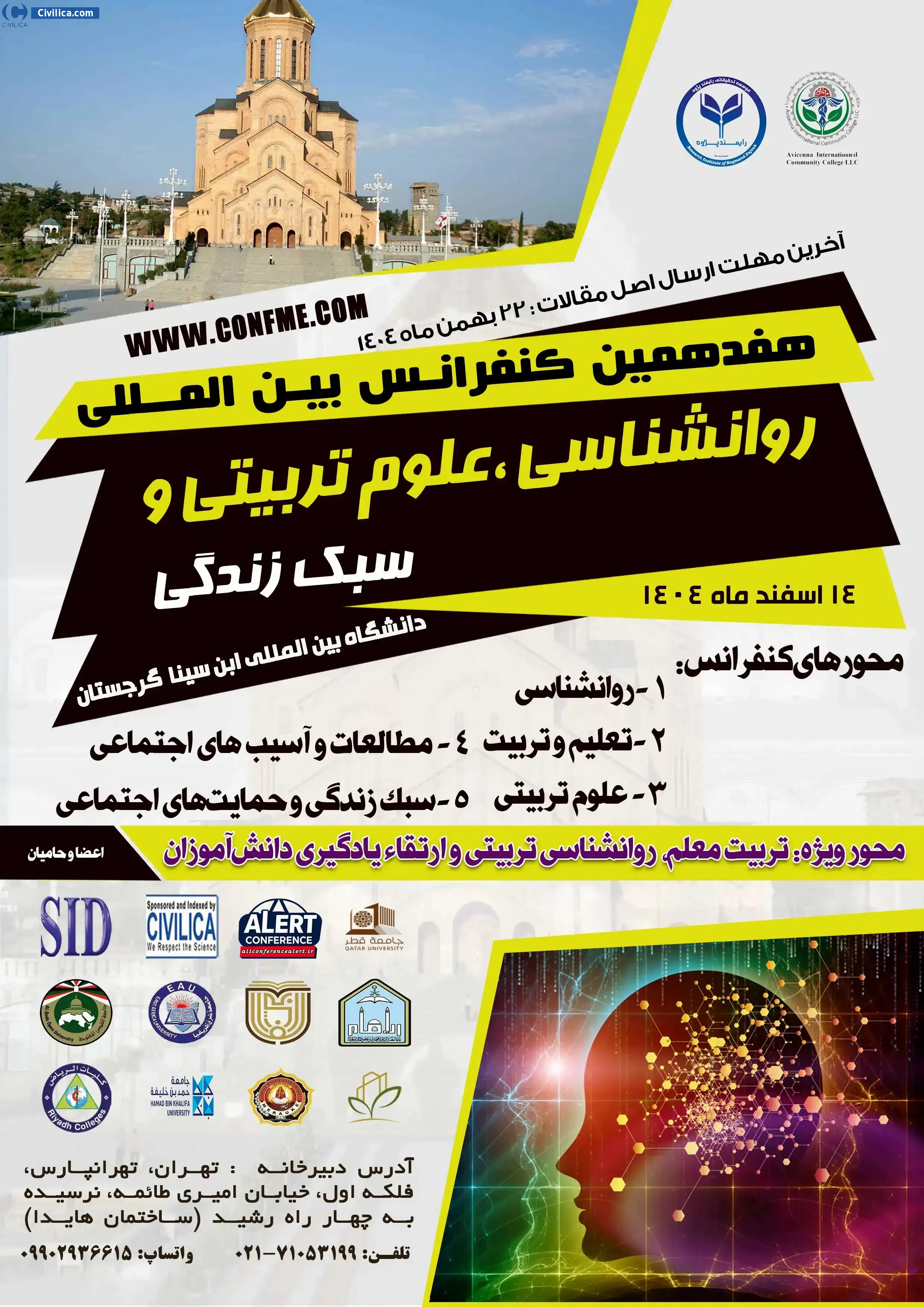 17th International Conference on Psychology of Education Sciences and Lifestyle In date 2026-03-05 by ,دانشگاه ابن سینا گرجستان با همکاری موسسه تحقیقاتی رایمند پژوه will be held.Since the conference held officially, all of this Conference paper and proceedings will be indexed in the Civilica database and Iranian Consortium of National Content (ICNC) and you can have full confidence.