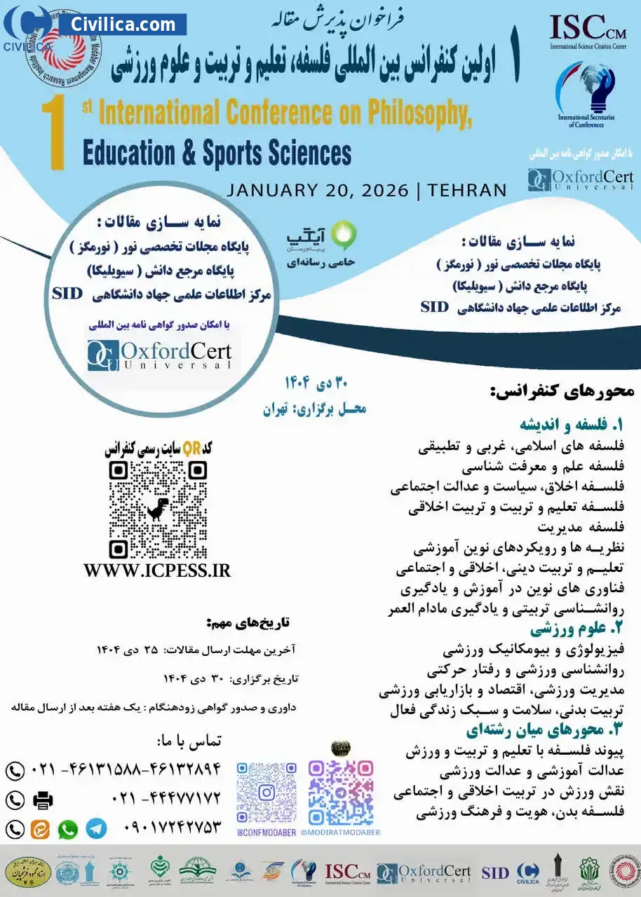 1st International Conference on Philosophy, Education and Sports Sciences In date 2026-01-20 by , in City Tehran will be held.Since the conference held officially, all of this Conference paper and proceedings will be indexed in the Civilica database and Iranian Consortium of National Content (ICNC) and you can have full confidence.