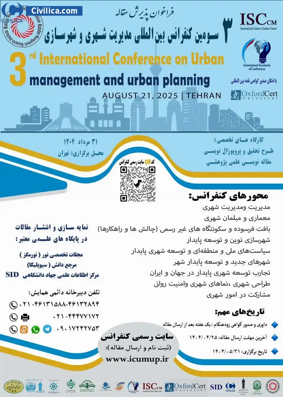 3th International Conference on Urban management and urban planning In date 2025-08-22 by ,موسسه پژوهشی مدیریت مدبر با مشارکت دانشگاهها و مجامع علمی in City Tehran was held. please refer to the following link to download all the papers of conference proceedings: Proceedings 3th International Conference on Urban management and urban planning