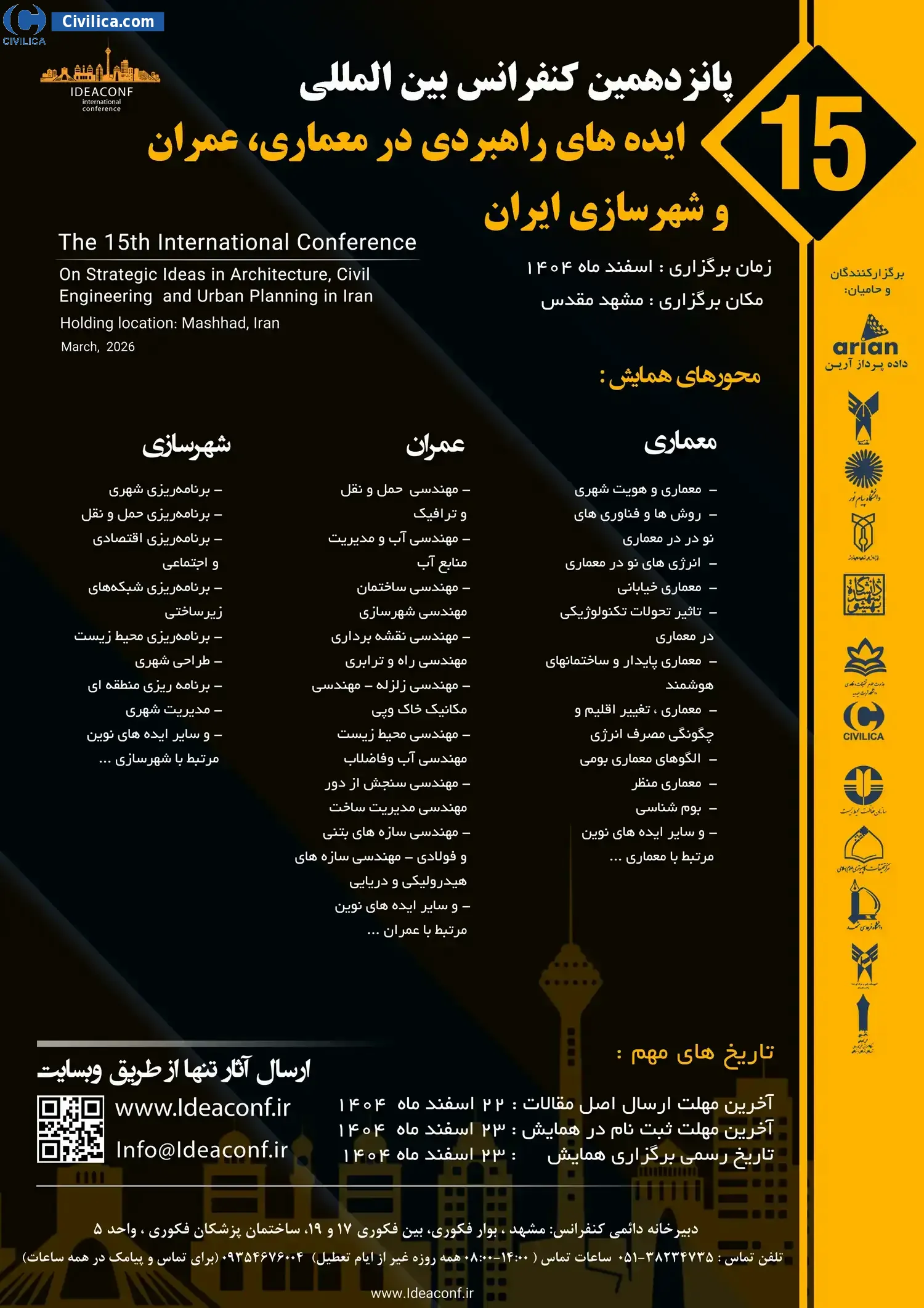 the 15th International Conference on Strategic Ideas in Architecture, Civil Engineering and Urban Planning in Iran In date 2026-03-14 by ,داده پرداز آرین با همکاری دانشگاههای معتبر ایران in City Mashhad will be held.Since the conference held officially, all of this Conference paper and proceedings will be indexed in the Civilica database and Iranian Consortium of National Content (ICNC) and you can have full confidence.