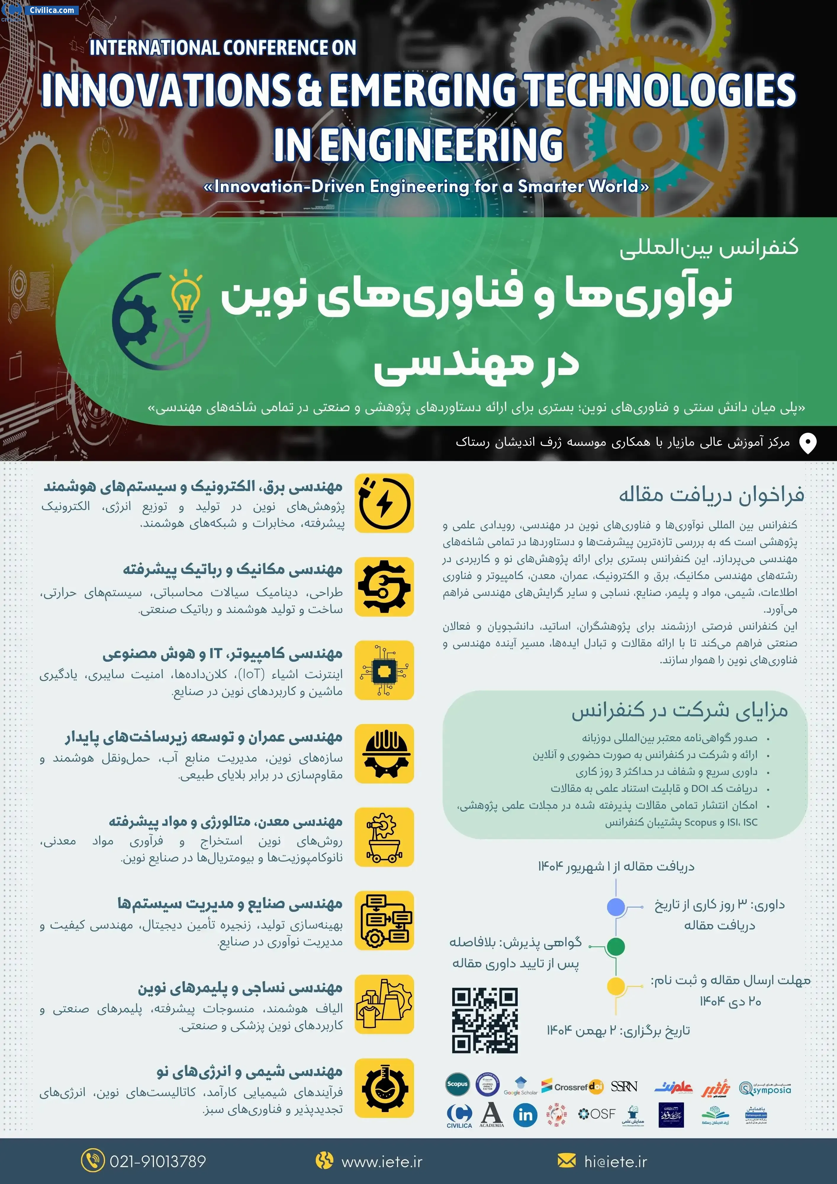 International Conference on Innovations & Emerging Technologies in Engineering In date 2026-01-22 by Maziar University,ژرف اندیشان رستاک in City Nur will be held.Since the conference held officially, all of this Conference paper and proceedings will be indexed in the Civilica database and Iranian Consortium of National Content (ICNC) and you can have full confidence.