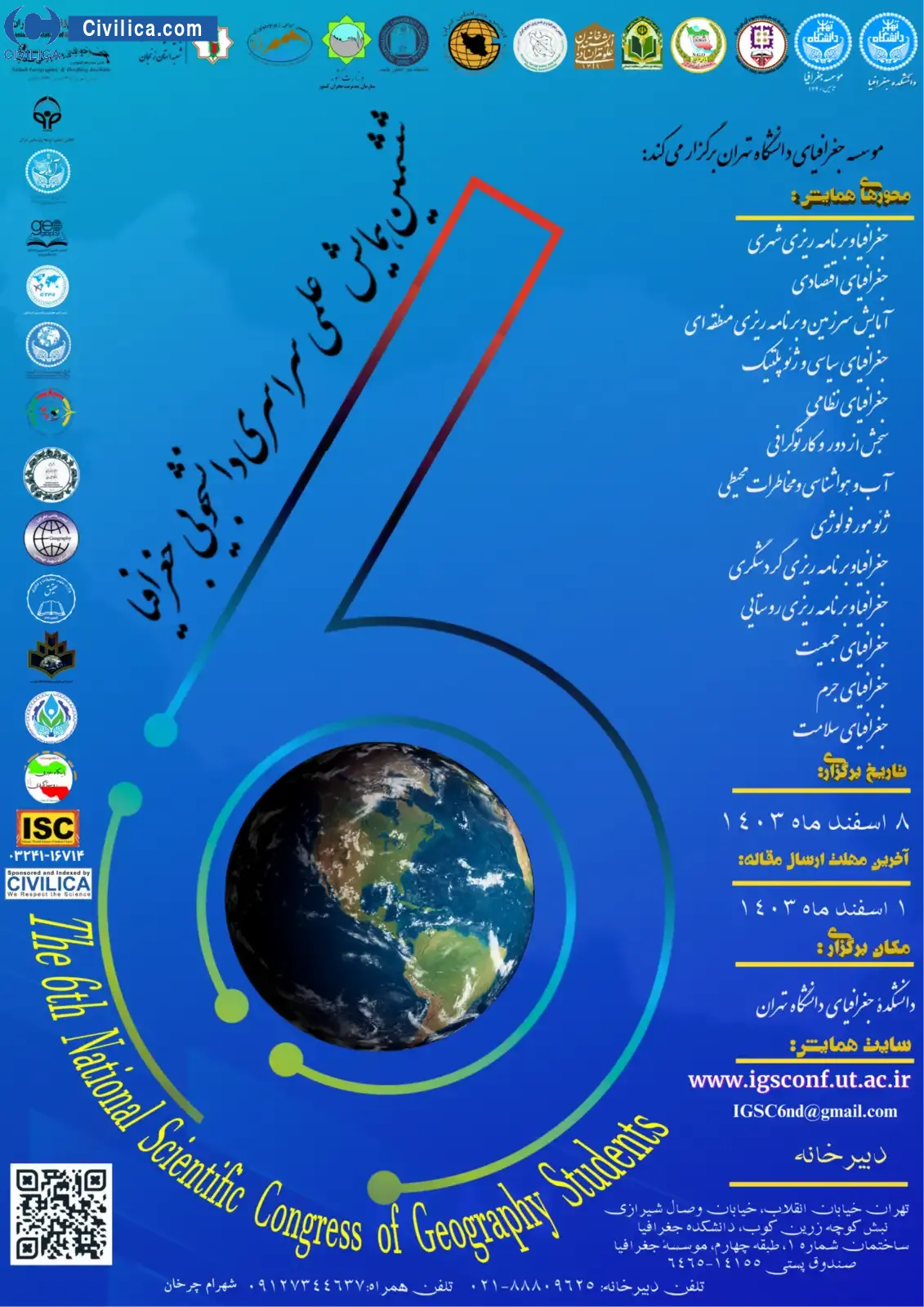 The Sixth National Scientific Conference on Geography In date 2025-02-26 by University of Tehran,موسسه جغرافیای دانشگاه تهران in City Tehran was held. please refer to the following link to download all the papers of conference proceedings: Proceedings The Sixth National Scientific Conference on Geography