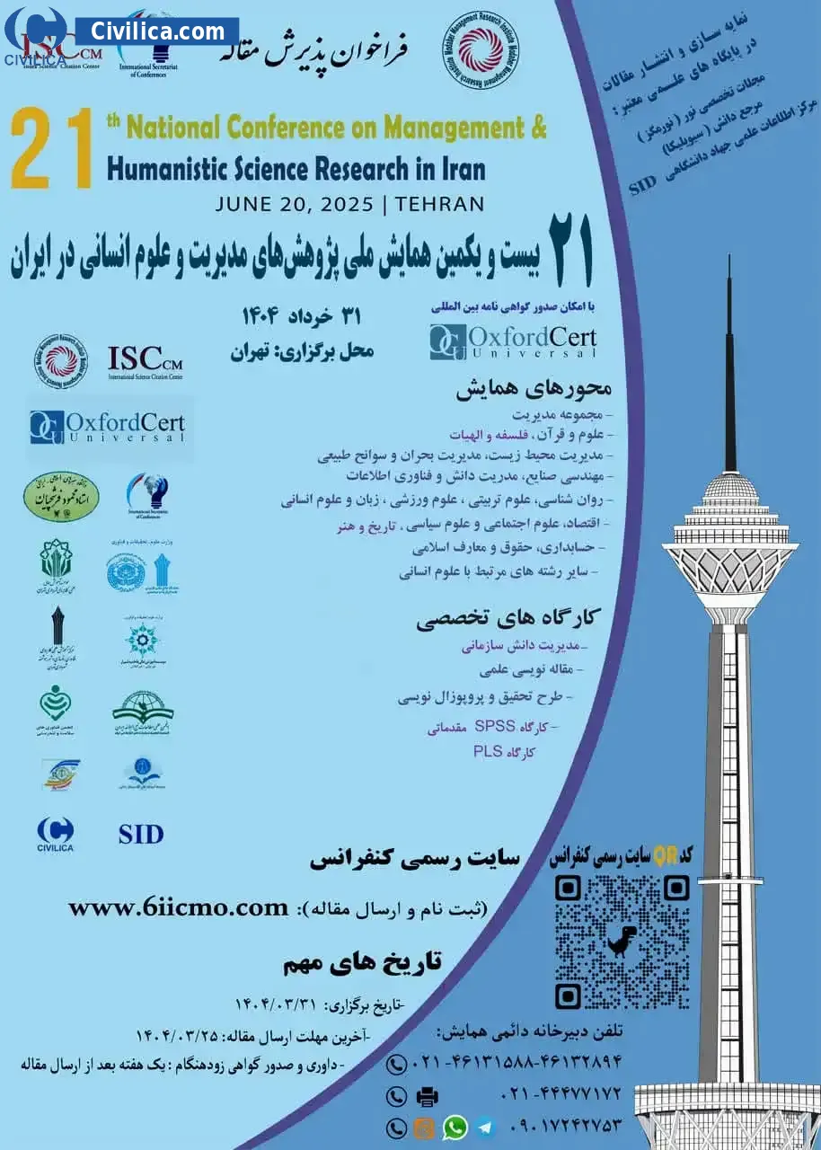 21th National Conference on Management Research and Humanities in Iran In date 2025-06-21 by , in City Tehran was held. please refer to the following link to download all the papers of conference proceedings: Proceedings 21th National Conference on Management Research and Humanities in Iran