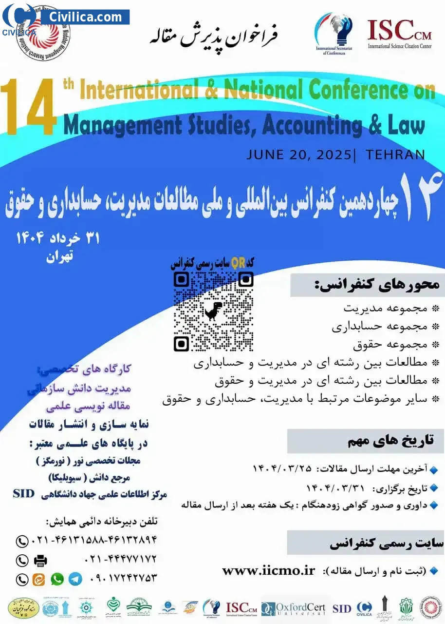 14th International and National Conference on Management, Accounting and Law Studies In date 2025-06-21 by , in City Tehran was held. please refer to the following link to download all the papers of conference proceedings: Proceedings 14th International and National Conference on Management, Accounting and Law Studies