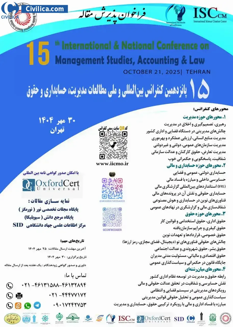 15th International and National Conference on Management, Accounting and Law Studies In date 2025-10-22 by , in City Tehran was held. please refer to the following link to download all the papers of conference proceedings: Proceedings 15th International and National Conference on Management, Accounting and Law Studies