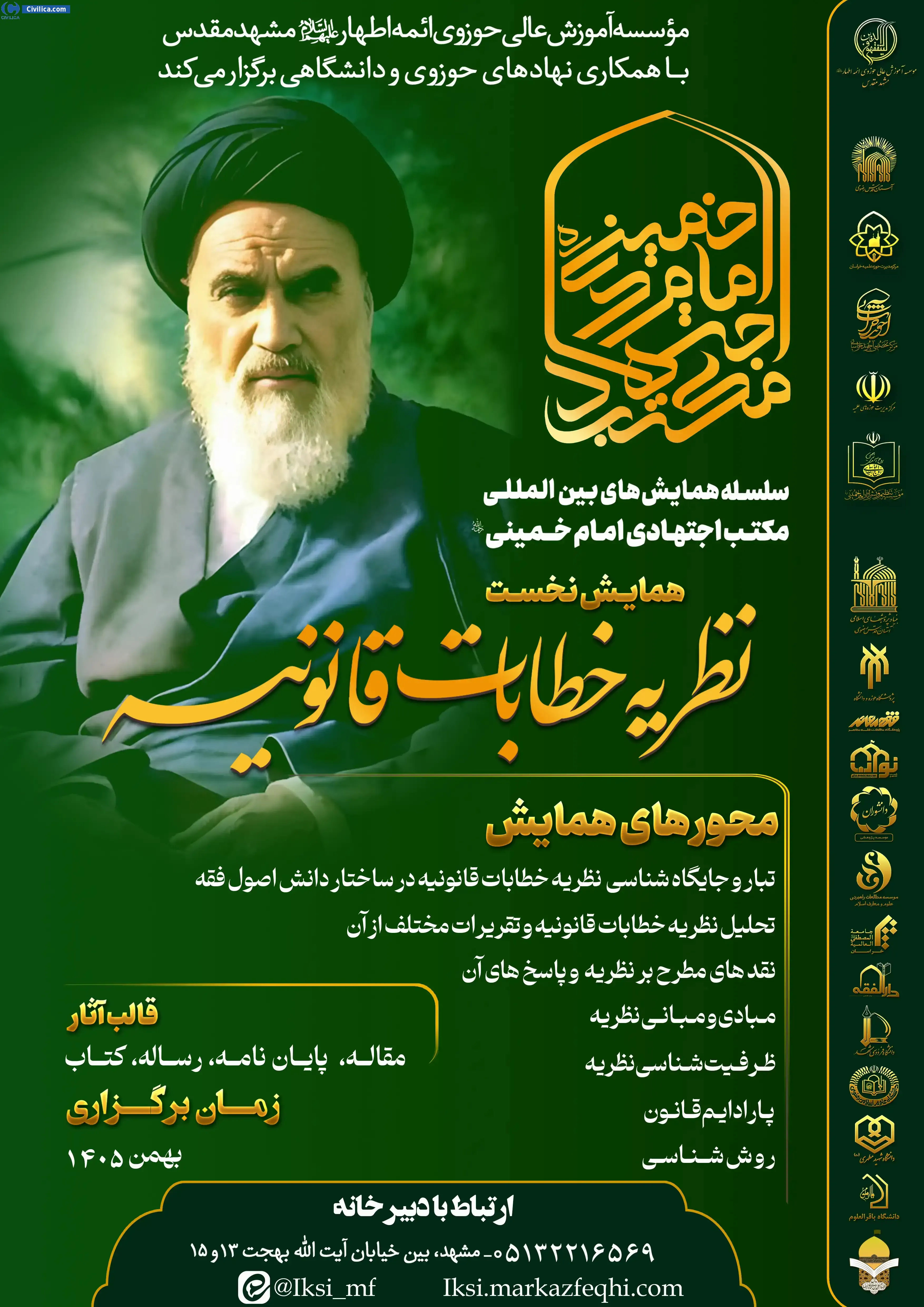The Series of International Conferences on Imam Khomeini (RA) School of Ijtihad: First Conference - The Theory of Legislative Injunctions (Khitabat-e Qanuniyyah) In date 2027-02-04 by ,موسسه آموزش عالی حوزوی ائمه اطهار (علیهم السلام) in City Mashhad will be held.Since the conference held officially, all of this Conference paper and proceedings will be indexed in the Civilica database and Iranian Consortium of National Content (ICNC) and you can have full confidence.