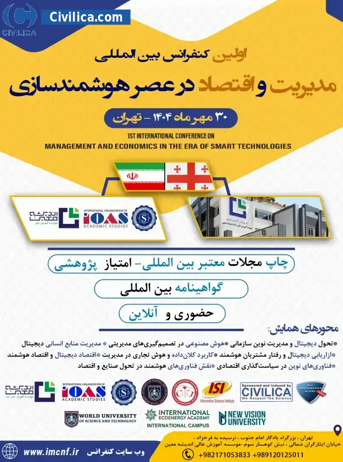 International Conference on Management and Economics in the Era of Smart Technologies In date 2025-12-10 by , سازمان بین المللی مطالعات دانشگاهی و موسسه عالی اندیشه معین in City Tehran will be held.Since the conference held officially, all of this Conference paper and proceedings will be indexed in the Civilica database and Iranian Consortium of National Content (ICNC) and you can have full confidence.
