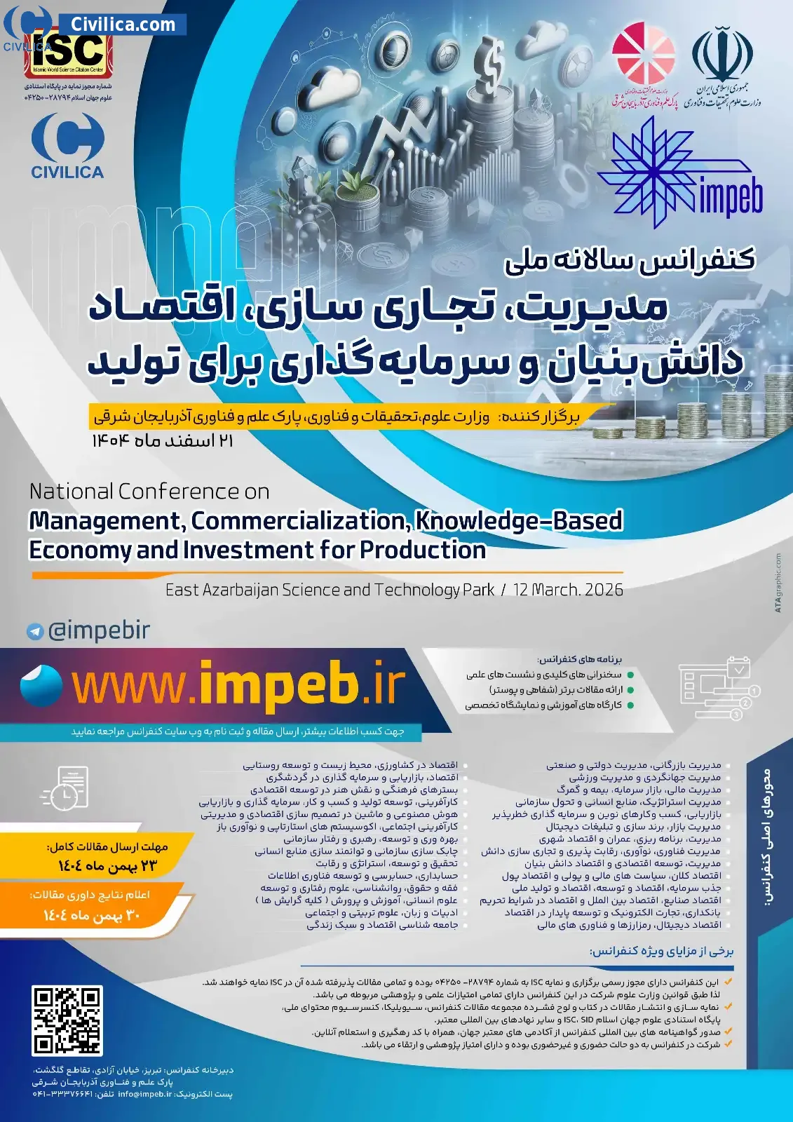 National Conference on Management, Commercialization, Knowledge-Based Economy and Investment for Production In date 2026-03-12 by ,وزارت علوم، تحقیقات و فناوری، پارک علم و فناوری آذربایجان شرقی، با همکاری ساير دانشگاه هاي برجسته كشور و تحت حمایت سیویلیکا will be held.Since the conference held officially, all of this Conference paper and proceedings will be indexed in the Civilica database and Iranian Consortium of National Content (ICNC) and you can have full confidence.