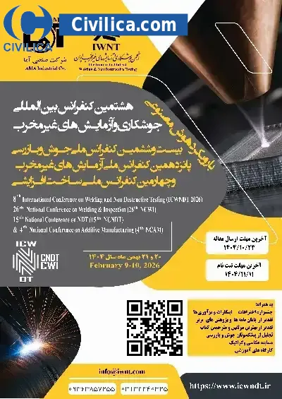8th International Conference on Welding and Non Destructive Testing & 26th National Conference on Welding & Inspection & 15th National Conference on NDT & 4th National Conference on Additive Manufacturing In date 2026-02-09 by ,Iranian Institute of Welding and Non Destructive Testingشرکت صنعتی آما in City Tehran will be held.Since the conference held officially, all of this Conference paper and proceedings will be indexed in the Civilica database and Iranian Consortium of National Content (ICNC) and you can have full confidence.