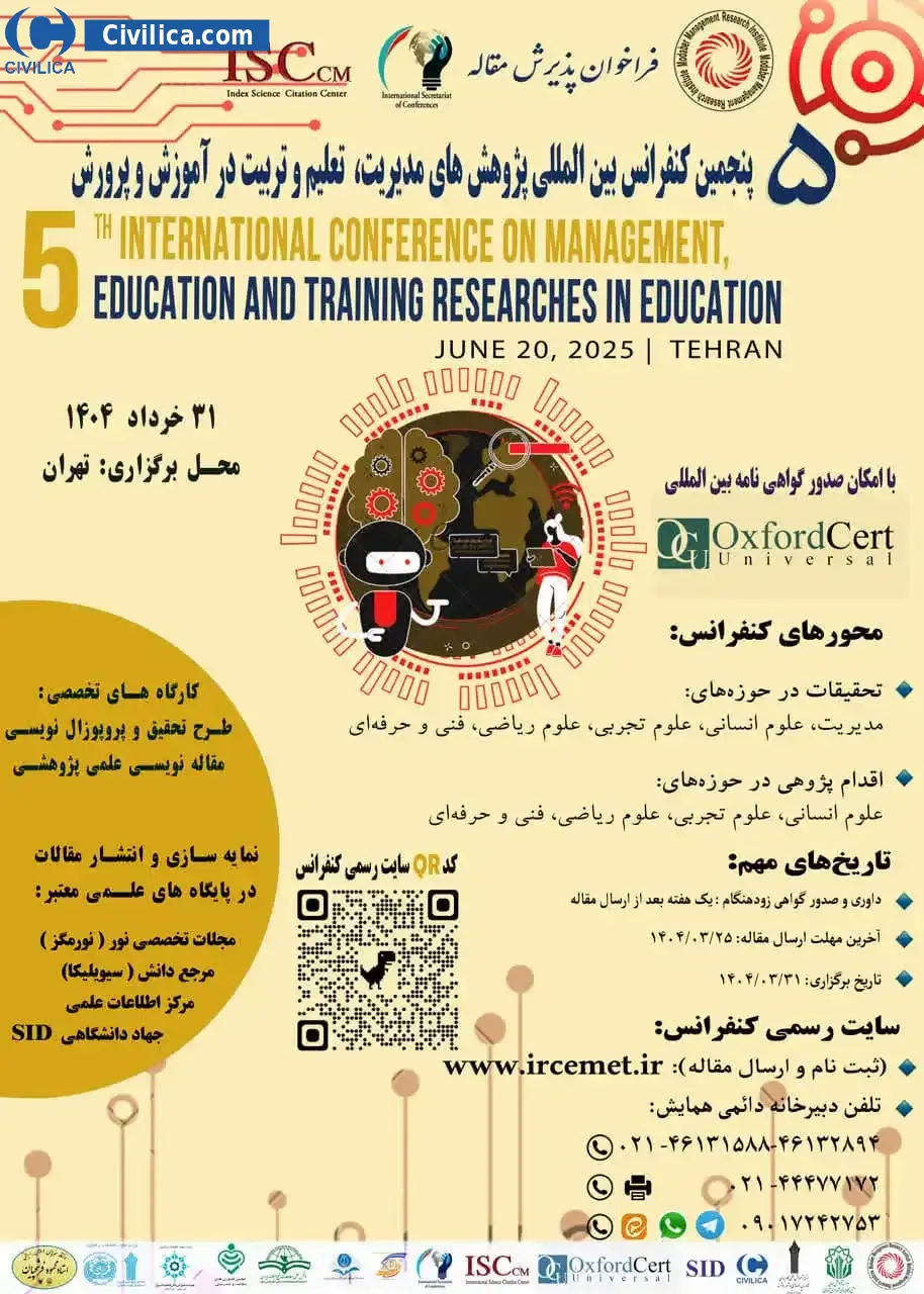 5th international conference on management, education and training researches in education and training In date 2025-06-20 by , in City Tehran was held. please refer to the following link to download all the papers of conference proceedings: Proceedings 5th international conference on management, education and training researches in education and training