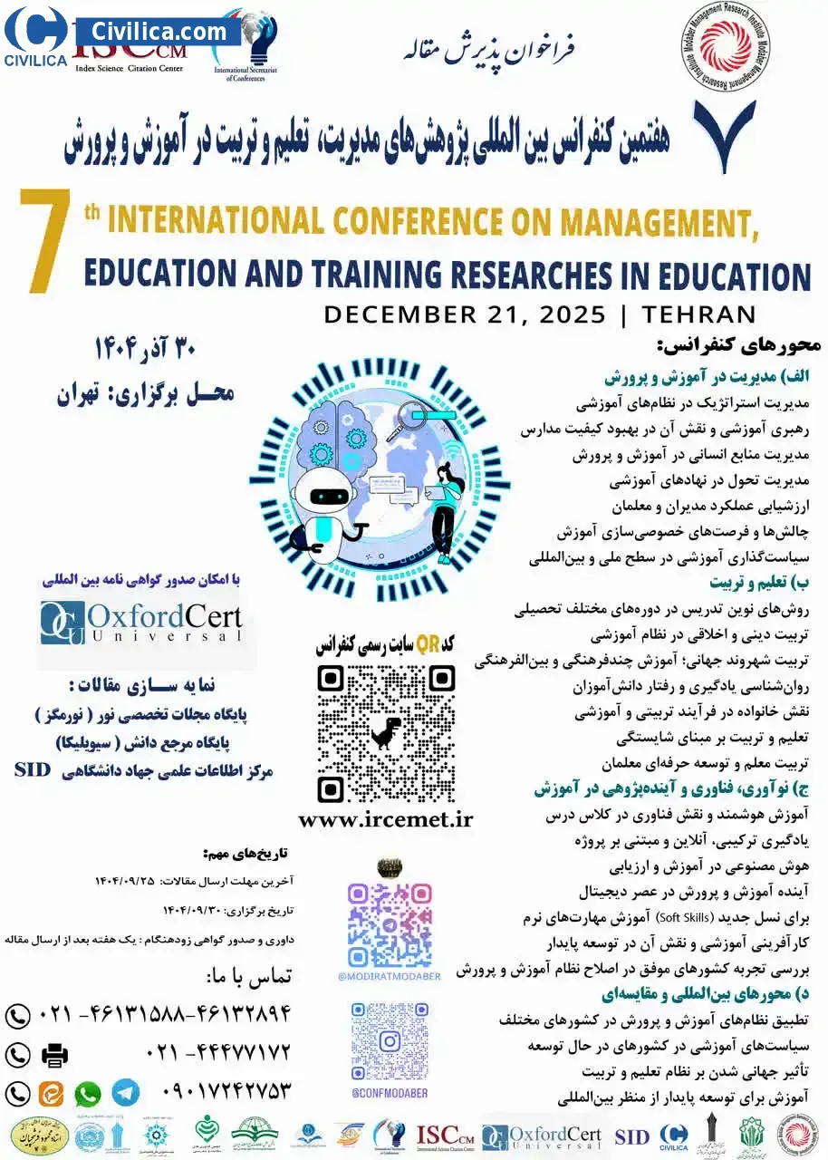 7th international conference on management, education and training researches in education and training In date 2026-03-16 by ,موسسه پژوهشی مدیریت مدبر و با مشارکت دانشگاه جامع علمی کاربردی خانه کارگر اسلامشهر و سایر مجامع علمی in City Tehran will be held.Since the conference held officially, all of this Conference paper and proceedings will be indexed in the Civilica database and Iranian Consortium of National Content (ICNC) and you can have full confidence.