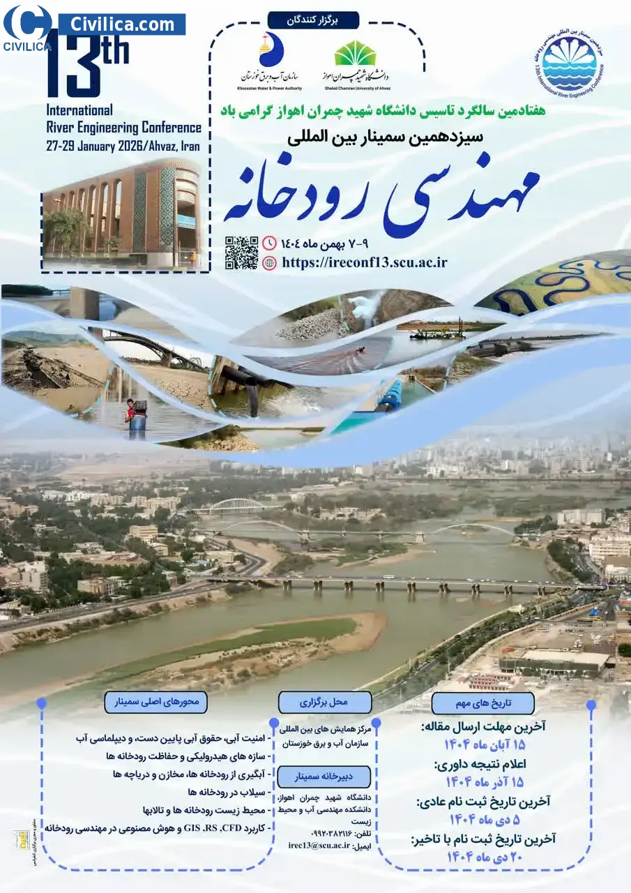 13th International River Engineering Conference In date 2026-01-27 by Shahid Chamran University of Ahvaz,سازمان آب و برق خوزستان in City Ahvaz will be held.Since the conference held officially, all of this Conference paper and proceedings will be indexed in the Civilica database and Iranian Consortium of National Content (ICNC) and you can have full confidence.