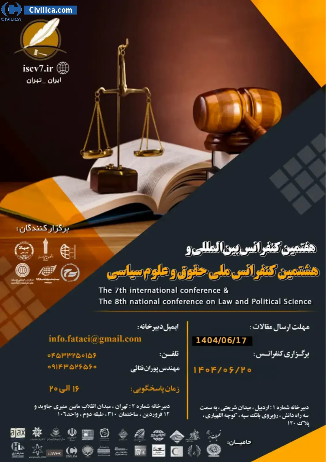 The 7th international conference &The 8th national conference on Law and Political Science In date 2025-09-11 by Acadcmic Center for Education, Culture and Research,دانشگاه علمی کاربردی پارس آبادموسسه زیست رهپویان ایده پرداز آرتاسازمان حقوقدانان بدون مرزمرکز بین المللی توسعه علم ، فرهنگ و عقلانیت in City Tehran was held. please refer to the following link to download all the papers of conference proceedings: Proceedings The 7th international conference &The 8th national conference on Law and Political Science