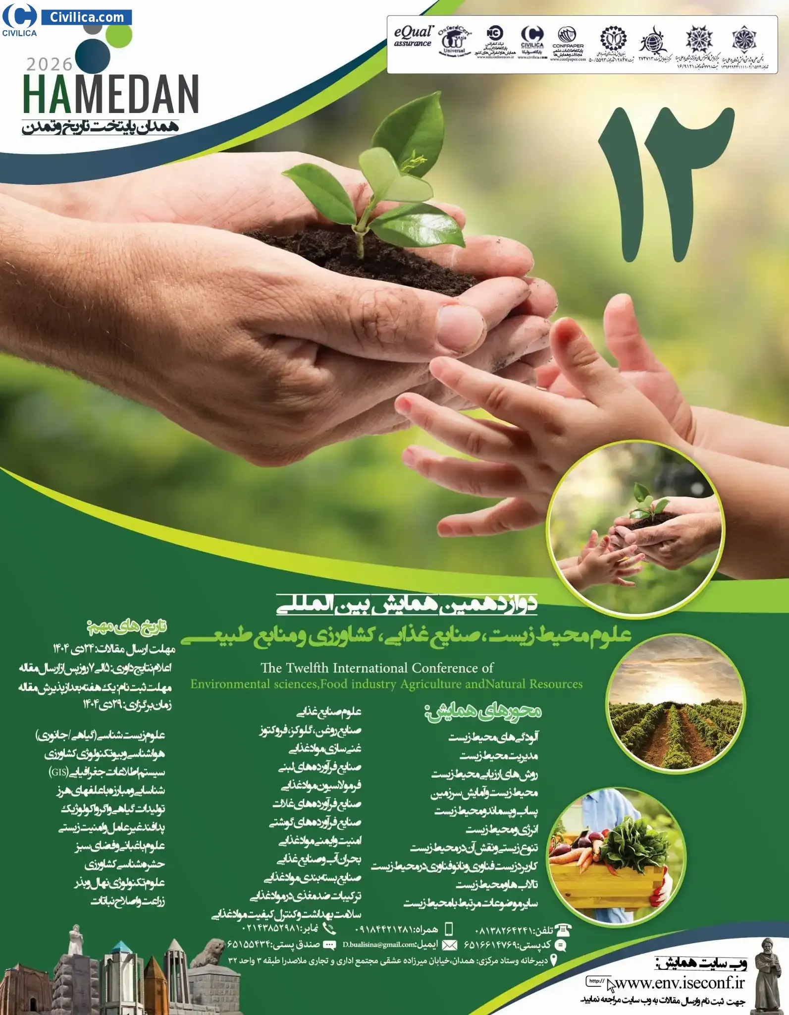 The Twelfth International Conference of Environmental sciences ,Food industry, Agriculture and Natural Resources In date 2026-01-19 by ,مرکز همایش و کنفرانس بوعلی سیناانجمن علمی پژوهشی دانش پژوهان بوعلی سینا in City Hamadan will be held.Since the conference held officially, all of this Conference paper and proceedings will be indexed in the Civilica database and Iranian Consortium of National Content (ICNC) and you can have full confidence.