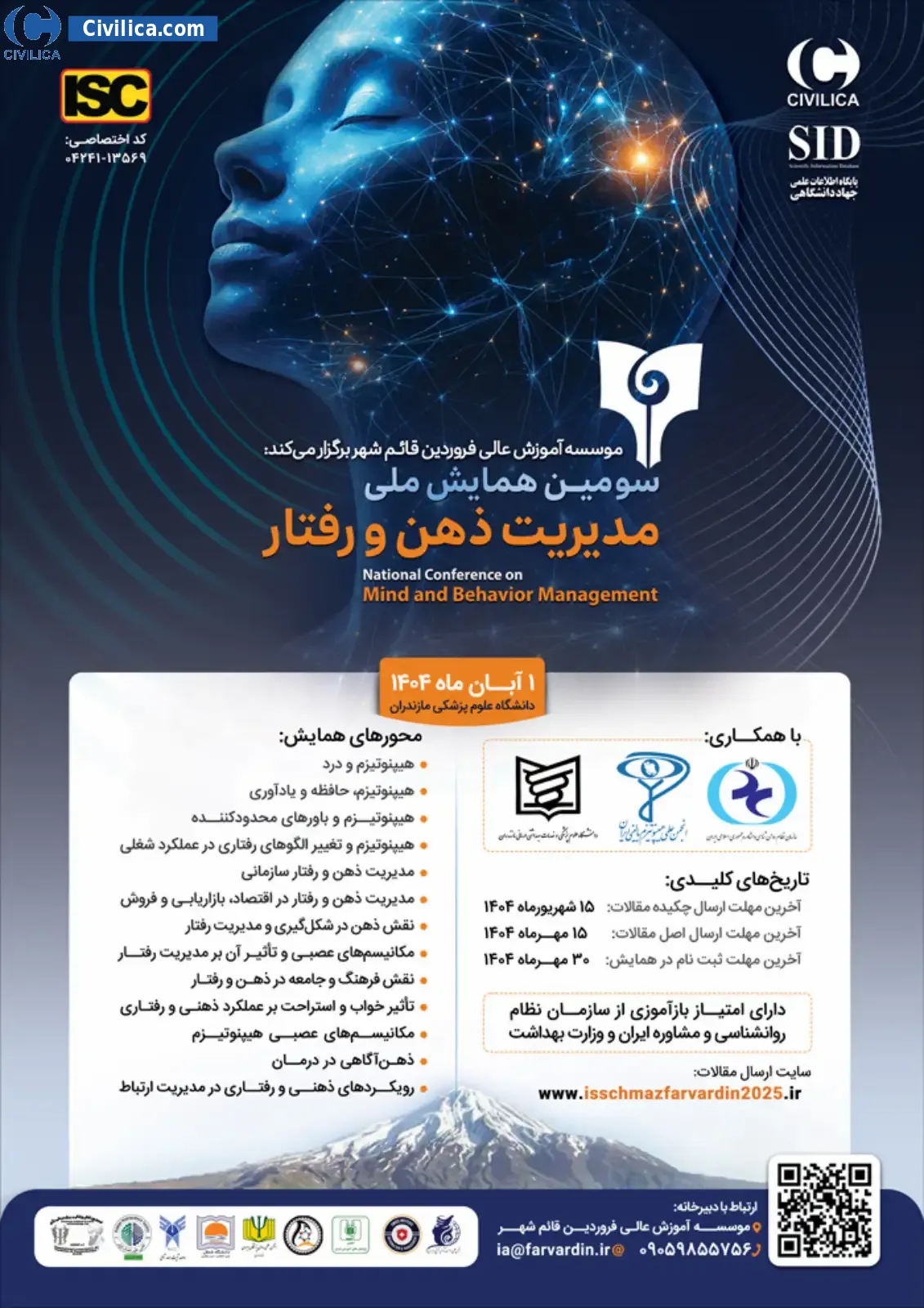 National Conference on "Mind and Behavior Management" In date 2025-10-23 by Farvardin Higher Education Institute,Iranian Scientific Society of Clinical Hypnosis in City Sari was held.This conference is held by Civilica Sponsoring and articles and will be indexed in CIVILICA