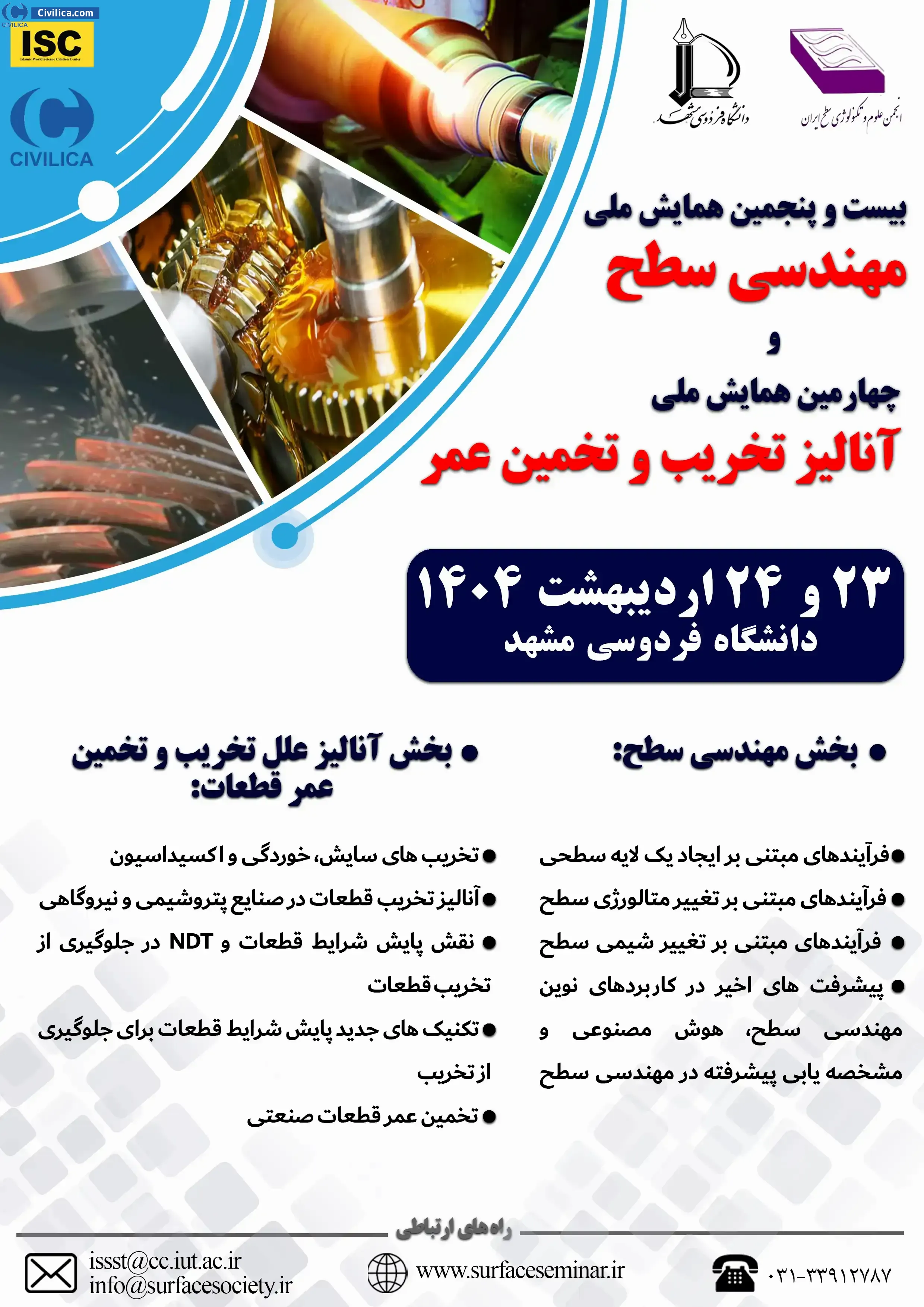 25th National Seminar on Surface Engineering and 4th Conference on Engineering Failure Analysis & Life Assessment In date 2025-05-13 by ,Iranian Society of Surface Science & Technology in City Mashhad was held. please refer to the following link to download all the papers of conference proceedings: Proceedings 25th National Seminar on Surface Engineering and 4th Conference on Engineering Failure Analysis & Life Assessment