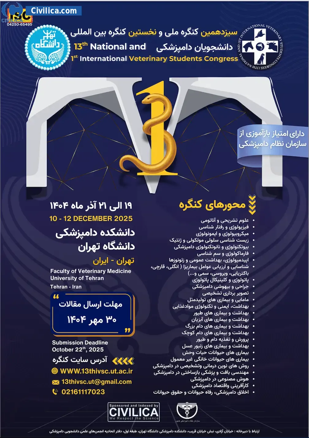 The 13th National and the 1st International Veterinary Congress In date 2025-12-10 by University of Tehran, in City Tehran was held.This conference is held by Civilica Sponsoring and articles and will be indexed in CIVILICA