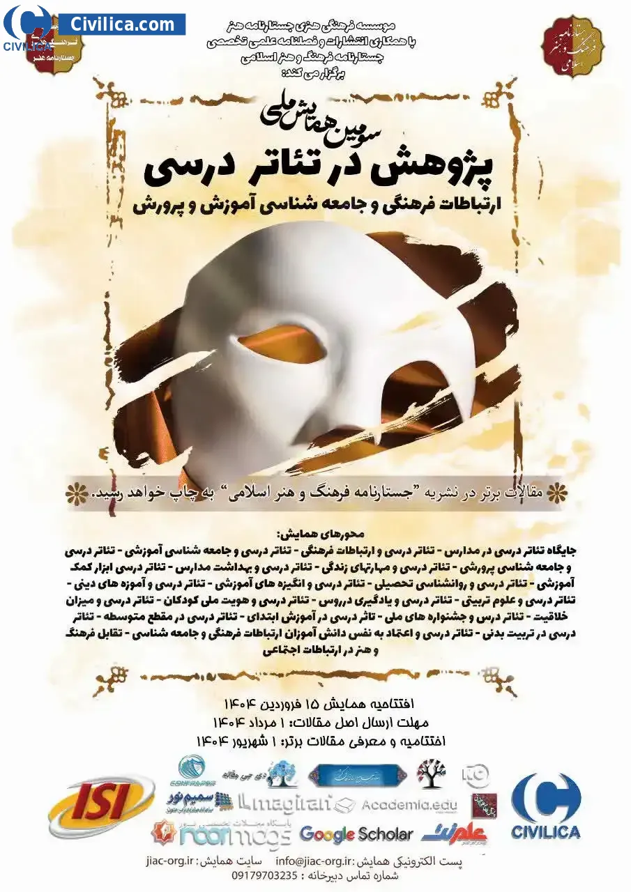The Third National Conference on Research in Educational Theater, Cultural Communication, and Sociology of Education In date 2025-08-23 by ,موسسه فرهنگی هنری جستارنامه هنرانتشارات کتاب و فصلنامه علمی تخصصی جستارنامه فرهنگ و هنر اسلامی in City Bandar Abbas was held. please refer to the following link to download all the papers of conference proceedings: Proceedings The Third National Conference on Research in Educational Theater, Cultural Communication, and Sociology of Education