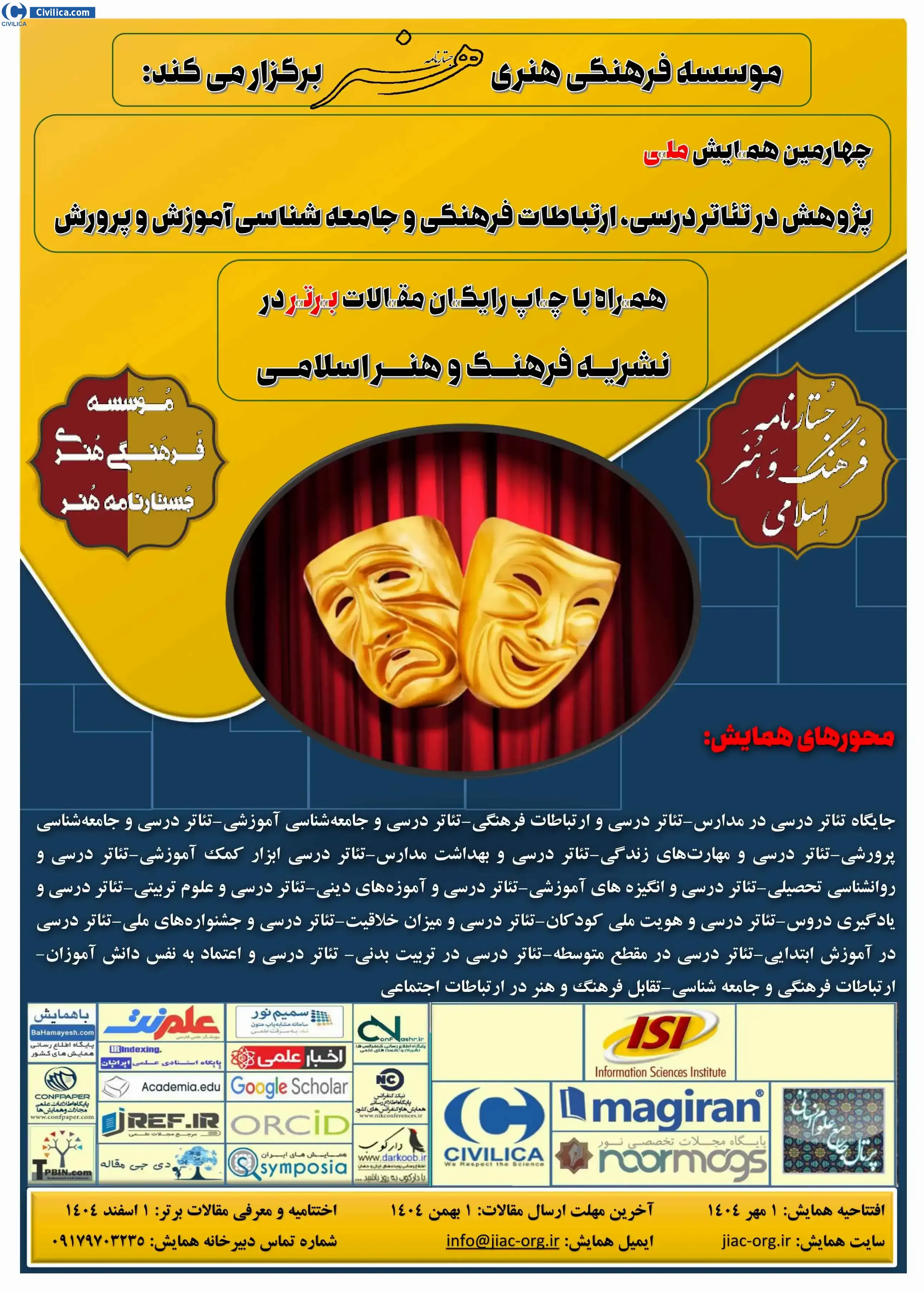 The Fourth National Conference on Research in Educational Theater, Cultural Communication, and Sociology of Education In date 2026-02-20 by ,موسسه فرهنگی هنری جستارنامه هنرانتشارات کتاب و فصلنامه علمی تخصصی جستارنامه فرهنگ و هنر اسلامی in City Tehran will be held.Since the conference held officially, all of this Conference paper and proceedings will be indexed in the Civilica database and Iranian Consortium of National Content (ICNC) and you can have full confidence.