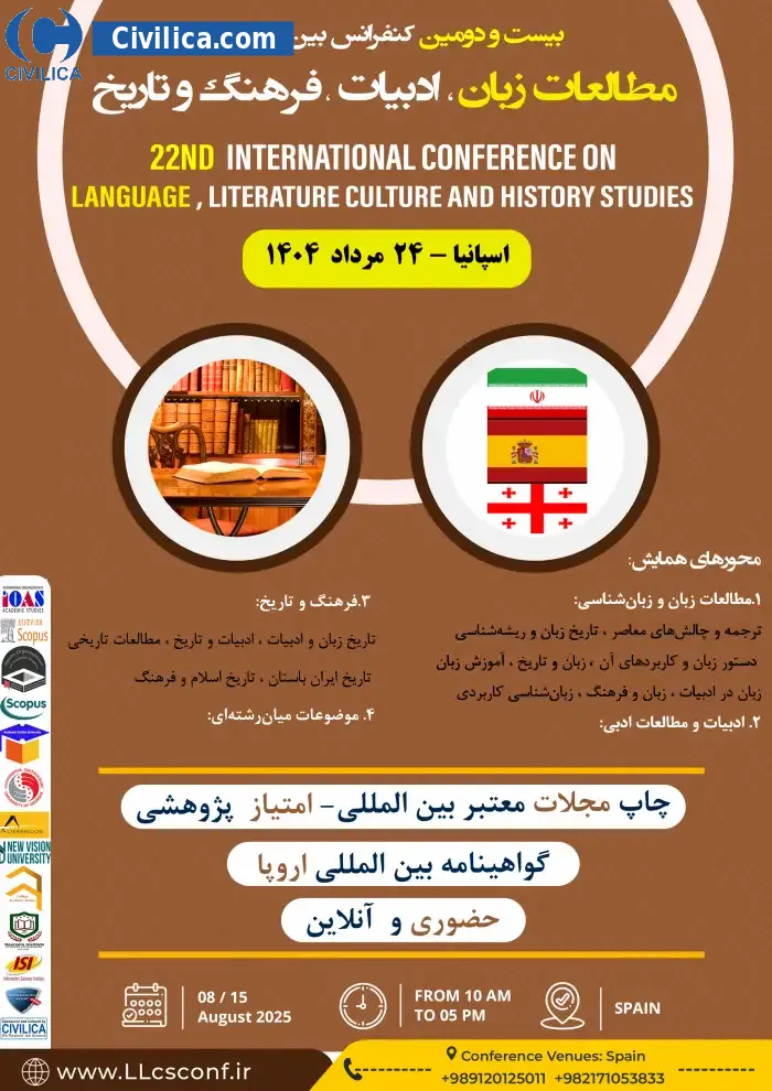 22nd International Conference on Language , Literature , Culture and History Studies In date 2025-08-15 by ,سازمان بین المللی مطالعات دانشگاهی in City Tehran was held. please refer to the following link to download all the papers of conference proceedings: Proceedings 22nd International Conference on Language , Literature , Culture and History Studies