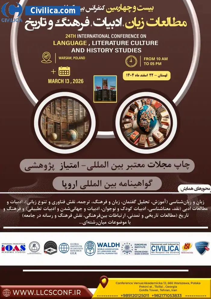 24th International Conference on Language , Literature , Culture and History Studies In date 2026-03-13 by , سازمان بین المللی مطالعات دانشگاهی(International Organization of Academic Studies و مرکز همایش ایران in City Tehran will be held.Since the conference held officially, all of this Conference paper and proceedings will be indexed in the Civilica database and Iranian Consortium of National Content (ICNC) and you can have full confidence.