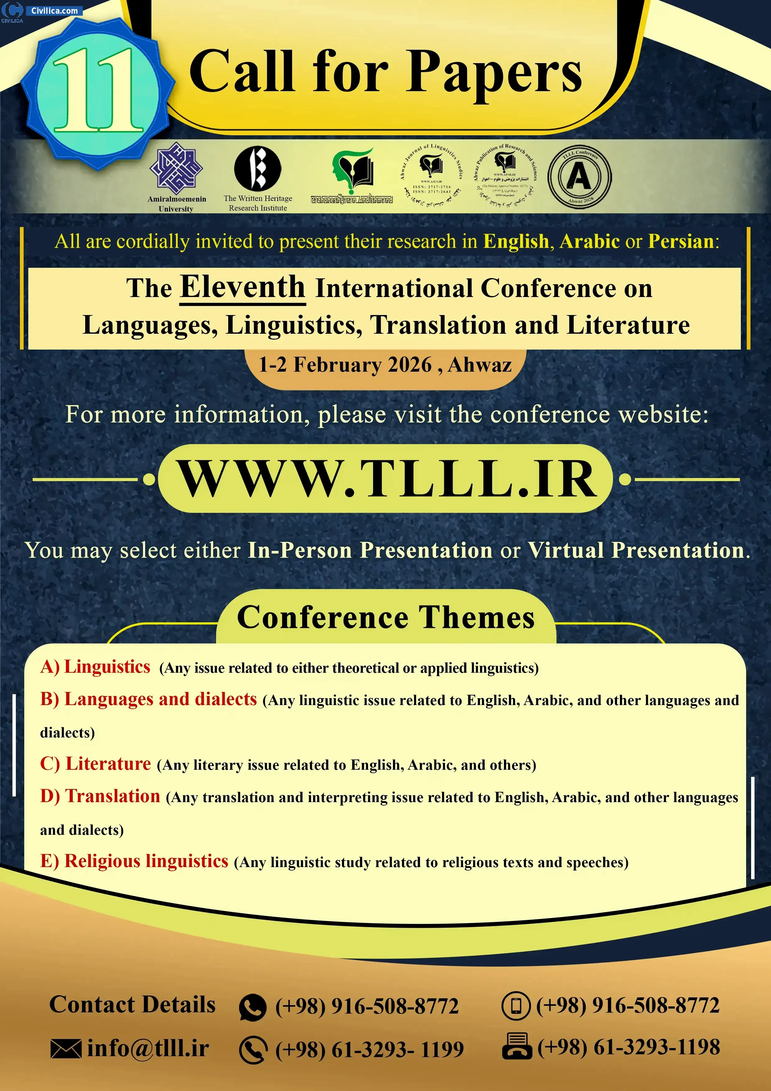 The 11th International Conference on Languages, Linguistics, Translation and Literature In date 2026-02-01 by ,موسسه پژوهشگران اندیشمند هدفمند in City Ahvaz will be held.Since the conference held officially, all of this Conference paper and proceedings will be indexed in the Civilica database and Iranian Consortium of National Content (ICNC) and you can have full confidence.