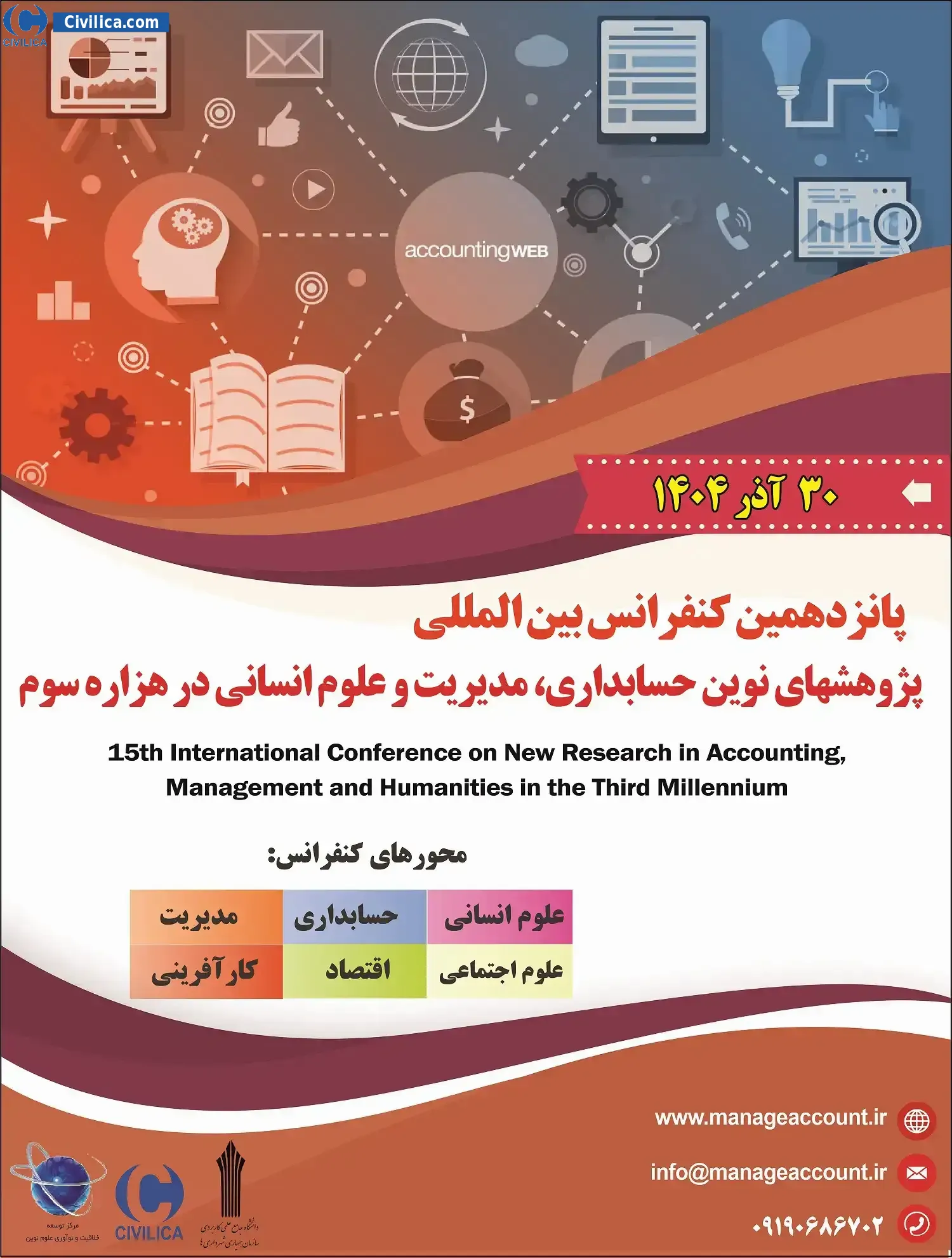 15th International Conference on New Research in Accounting, Management and Humanities in the Third Millennium In date 2025-12-21 by ,دانشگاه جامع علمی کاربردی سازمان همیاری شهرداری ها و مرکز توسعه خلاقیت و نوآوری علوم نوین in City Tehran will be held.Since the conference held officially, all of this Conference paper and proceedings will be indexed in the Civilica database and Iranian Consortium of National Content (ICNC) and you can have full confidence.