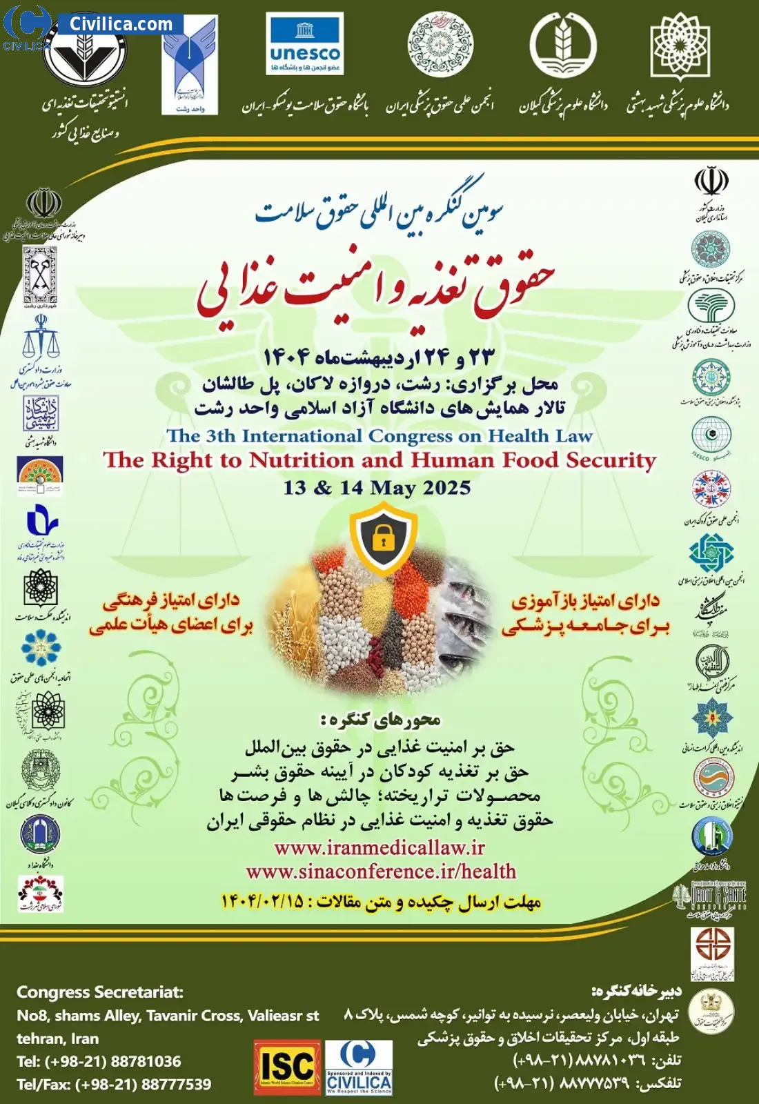 The 3th International Congress on Health Law The Right to Nutrition and Human Food Security In date 2025-05-13 by ,The Iranian Association of Medical Law in City Rasht was held. please refer to the following link to download all the papers of conference proceedings: Proceedings The 3th International Congress on Health Law The Right to Nutrition and Human Food Security